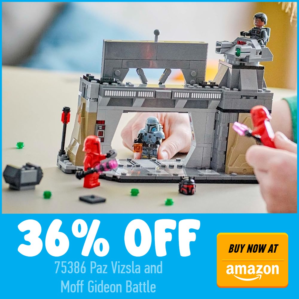 LEGO Star Wars 75386 Paz Vizsla y Moff Gideon Batalla También tiene un 36% de descuento, quedando en poco más de £20. Incluye una minifigura exclusiva con la cabeza impresa de una celebridad, así como todo lo necesario para crear un diorama basado en The Mandalorian.