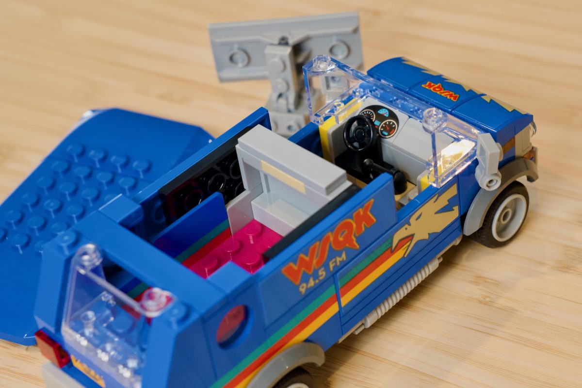 Esto es especialmente cierto en el caso de la furgoneta, que incorpora una construcción compleja para lograr ángulos cerrados y pequeños desfases, como el hueco para la matrícula trasera. Es una pena que no haya ningún kit de rastreo de Dustin en la parte trasera de la furgoneta (el interior está completamente vacío) y que el coche de Steve solo tenga cabida para una minifigura, pero al menos el radar de la parte superior se puede cambiar fácilmente entre vehículos. No hace falta taladrar, amigos.