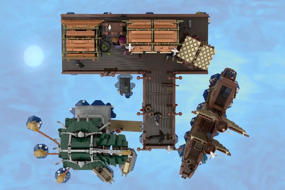La construcción principal recrea naturalmente el muelle principal, además de dar cuerpo a los alrededores con puestos de mercado, un carrito de comida callejera, la torre del muelle y su puente de conexión, un barco y dos barcos más pequeños atracados a lo largo del muelle y bases de agua para sostener los pilares del muelle, la torre y los barcos.