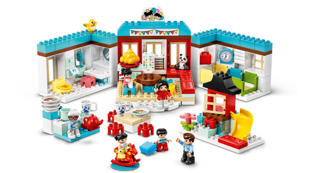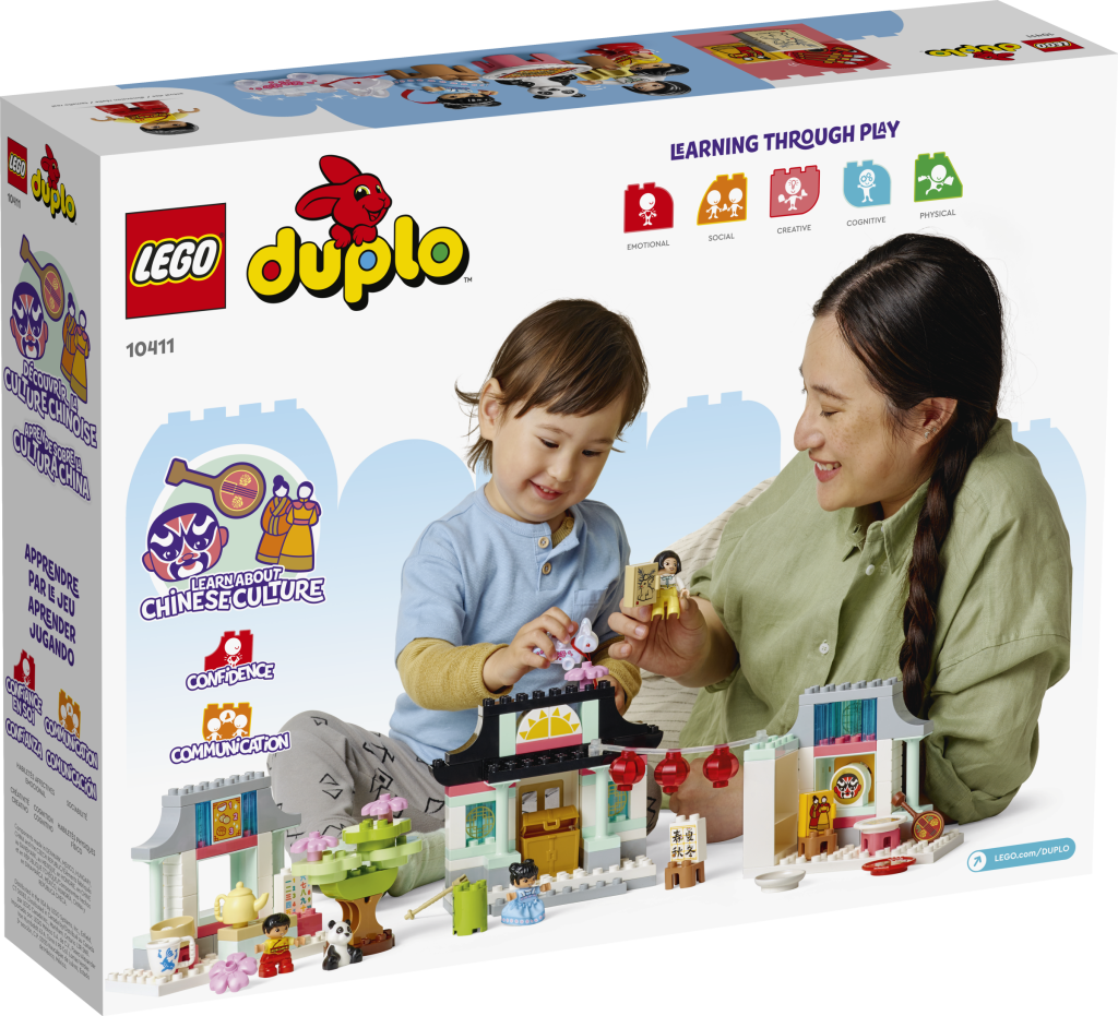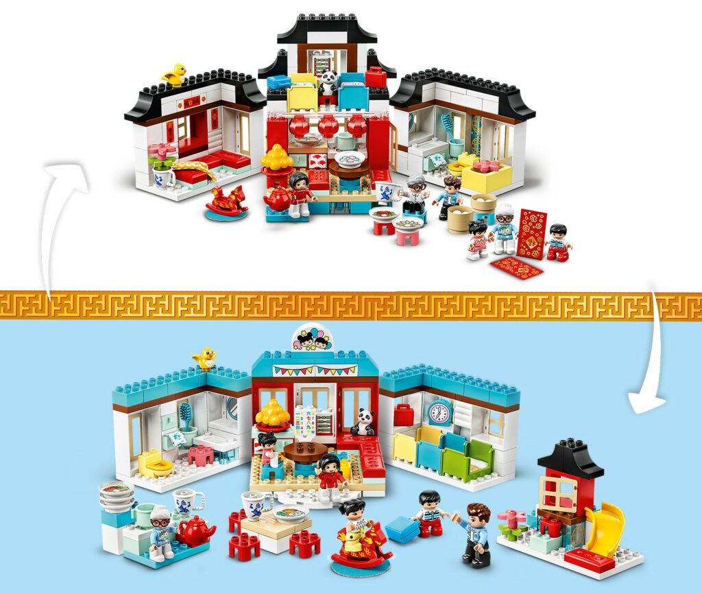 El DOBLE El juego incluye tres figuras y un panda, así como varios accesorios diseñados para enseñar a los niños más pequeños sobre la cultura china, como su nombre indica. Este concepto es similar al de 10943 Momentos felices de la infancia, que fue lanzado en 2021.