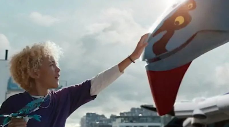 Presenta a una de las banshees de 75572 Jake & Neytiri's First Banshee Flight volando sobre rascacielos y hasta un balcón, donde un niño la toca en la cabeza.
