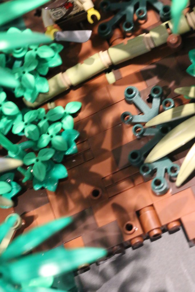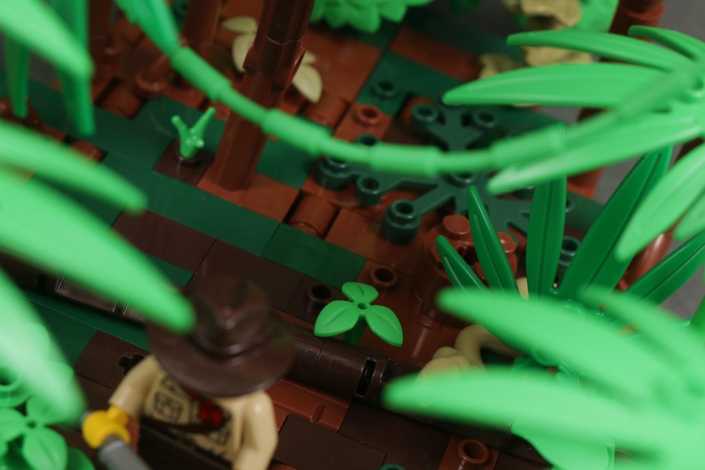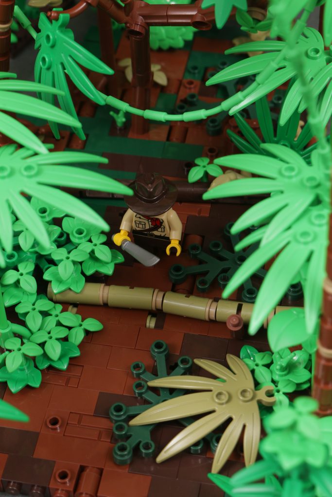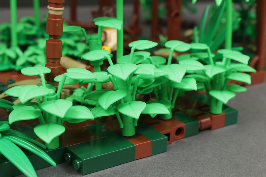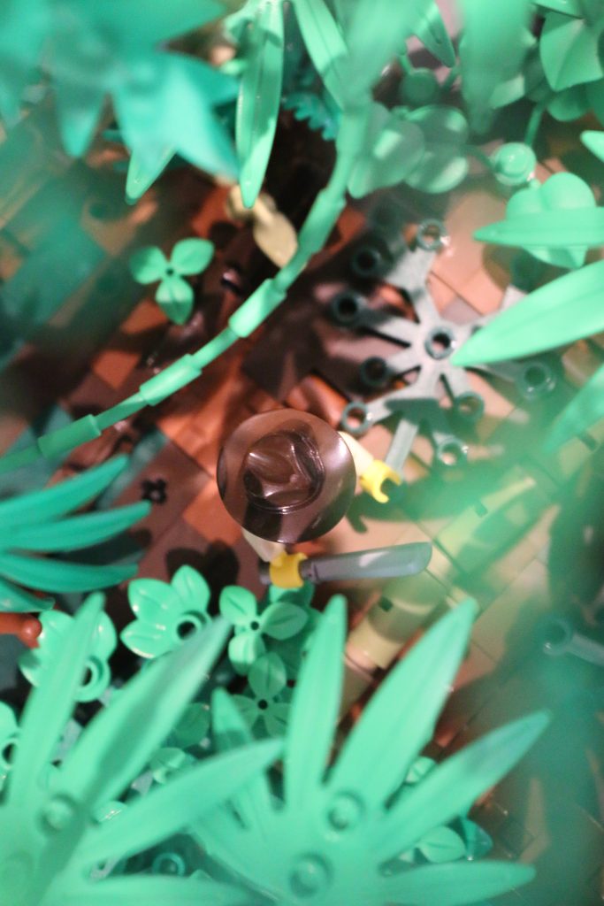 La superficie más plana del suelo también está diseñada a propósito para resaltar mejor y permitir que las sombras y la luz del dosel superior la diseñen. El suelo sigue estando coloreado con marrón rojizo, marrón oscuro y verde oscuro para imitar la mezcla de barro y vegetación típica, con detalles ocasionales como árboles caídos y hojas viejas traídas desde arriba. Sin embargo, su propósito principal es dar espacio a nuestras minifiguras y acentuar el efecto de la luz y las sombras que se reflejan a través del dosel superior. Un suelo demasiado recargado lo ocultaría.