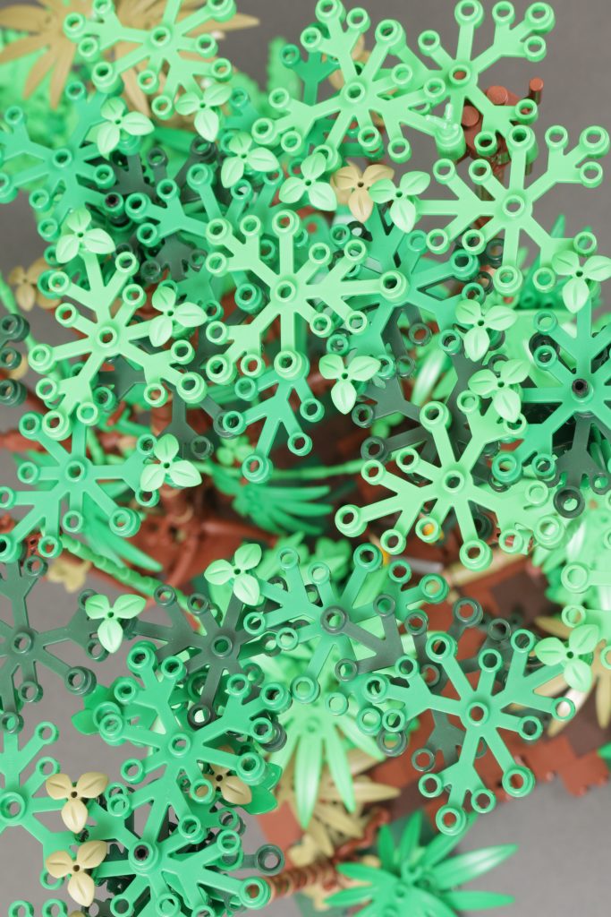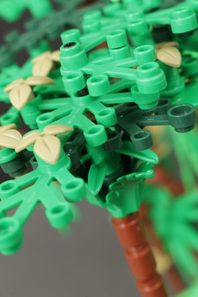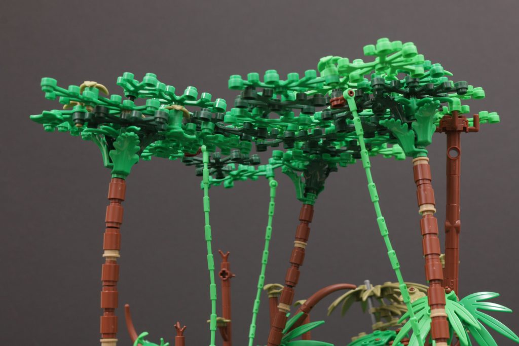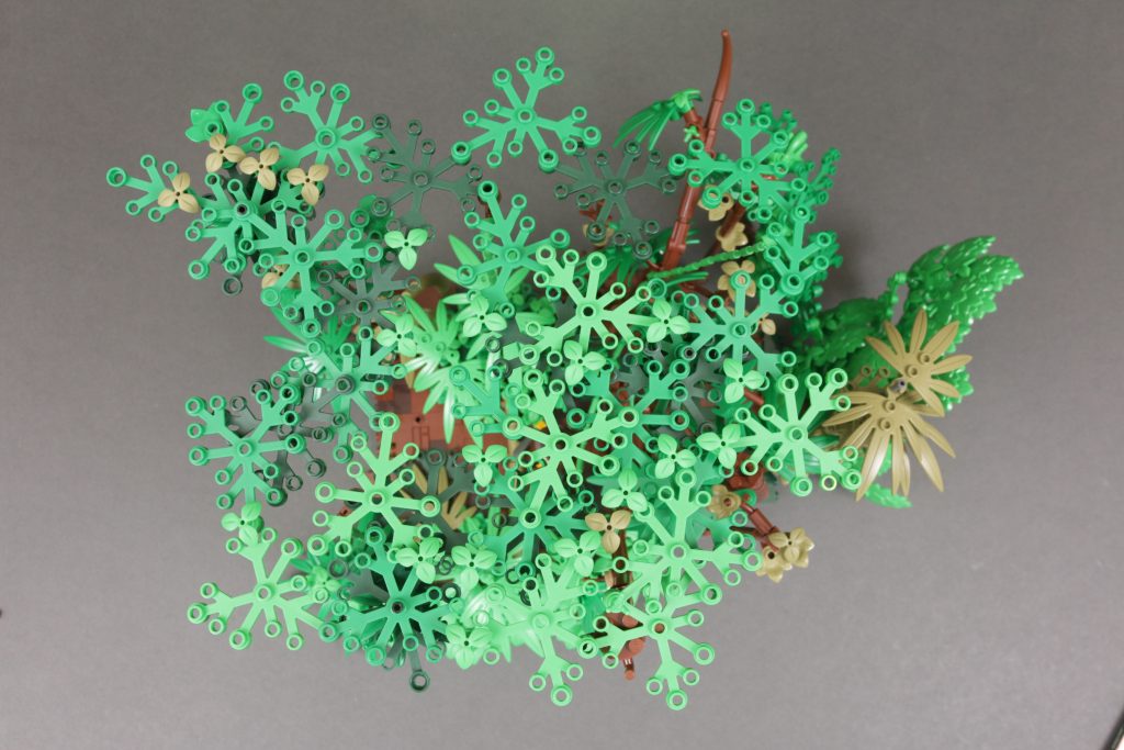 La dosel La técnica no es nada innovadora, ya que se basa en las antiguas piezas de hojas de plantas de 4×2 y 6×5 (2423 y 2417), unidas por tallos de plantas (37695). Sin embargo, es importante destacar que esto proporciona el efecto ideal de dejar pasar cantidades esporádicas de luz, crea un efecto de sombra realista y permite la instalación de numerosos anti-tachones aleatorios para conectar las copas de los árboles.