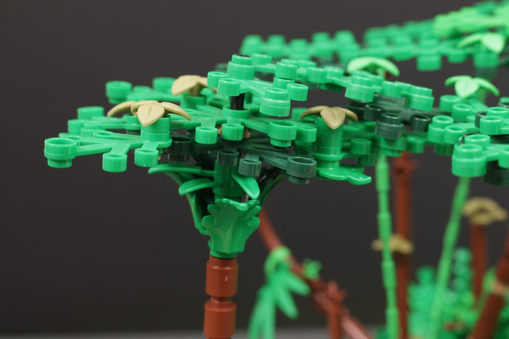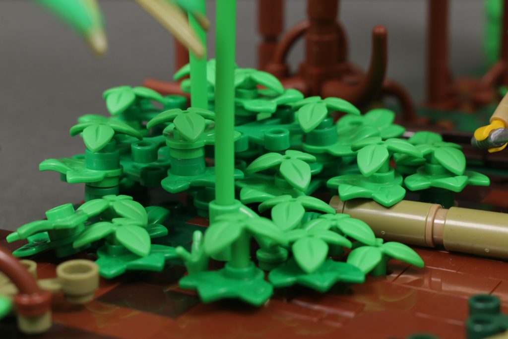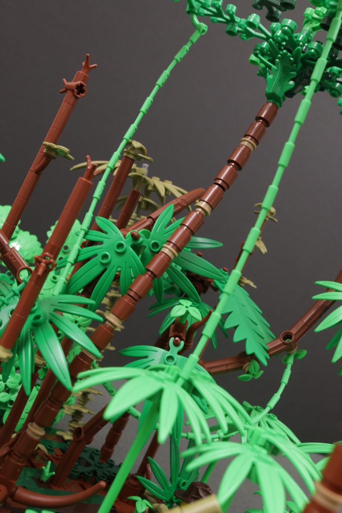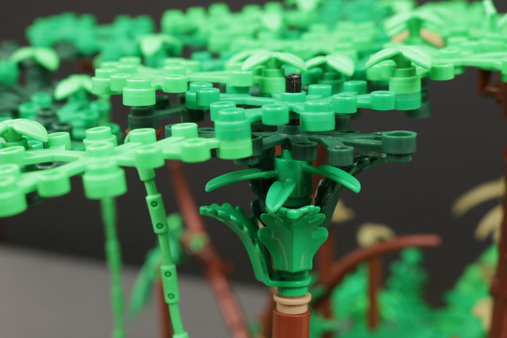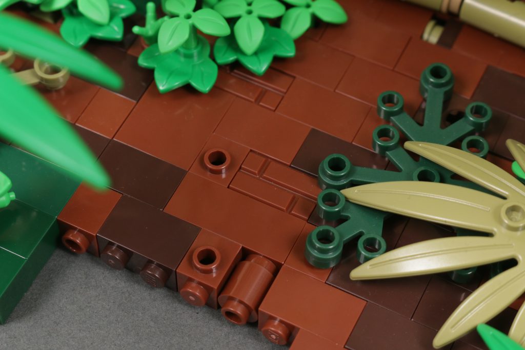 Con los árboles y el dosel resueltos, es cuestión de imitar el mismo efecto en el piso, con montantes para que el extremo inferior de cada árbol se deslice y ancle toda la estructura. El suelo se construyó con ladrillos de 1×1, 1×2, 1×3 y 1×4, y ladrillos modificados de 1×1 con un montante lateral, todos colocados de lado para crear una apariencia lisa, con montantes esporádicos disponibles para conectar árboles y plantas.