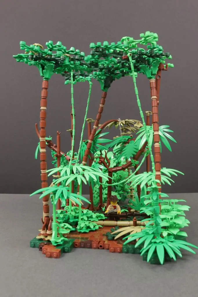 Pero no todas las junglas se ven así, y no todas las junglas que quieras construir funcionarán con una simple mezcla de vegetación LEGO. Entonces, ¿de qué otra manera podría quedar una jungla LEGO si, por ejemplo, consideras la luz y la composición tanto como las piezas que usas?