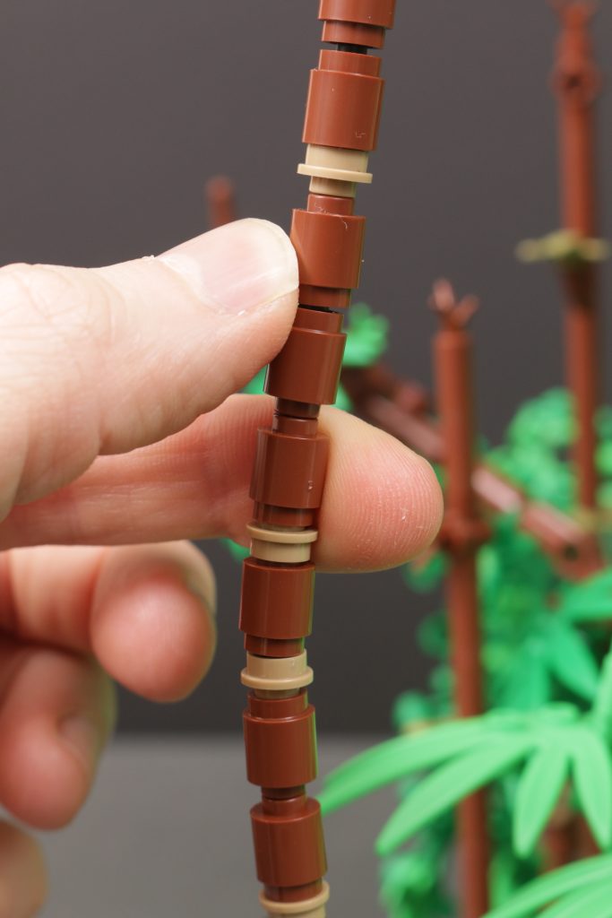 Tras rematar el árbol con un par de ladrillos para plantas con hojas de bambú (30176) y la nueva hoja vertical curva (2682), el extremo superior de la manguera se conecta a la copa mediante uno de los muchos soportes antivuelco disponibles. Se pueden conectar a uno directamente debajo, o el árbol se puede doblar y estirar ligeramente para conectarlo a un soporte antivuelco un poco más a un lado, creando así el efecto de árbol sinuoso.