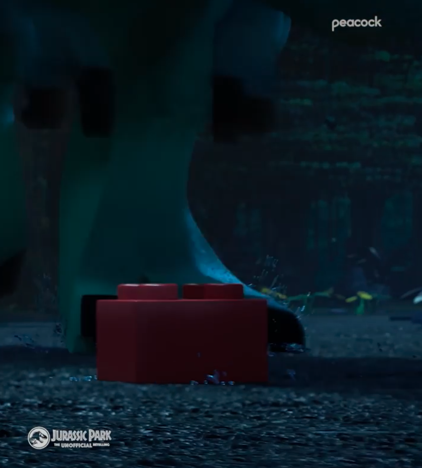 La clásico El humor de las películas de LEGO también está en juego, con Malcolm arrojando un ladrillo LEGO rojo desde la parte trasera del Jeep, dejando al T.rex aullar de dolor cuando lo pisa, un dolor con el que casi todos los fanáticos de LEGO podrán identificarse. Pobre T.rex, es todo lo que tenemos que decir.