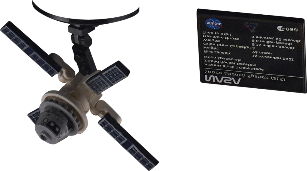 10341 NASA ArtSistema de lanzamiento espacial emisEl cohete de varias etapas de la NASA, con dos propulsores de combustible sólido, está acompañado por una torre de lanzamiento móvil que incorpora umbilicales retráctiles, un puente de tripulación y un soporte para el cohete. A ellos se suma una pequeña maqueta de la nave espacial Orión, que puede exhibirse por separado o colocarse dentro del cohete gracias a sus paneles solares plegables.