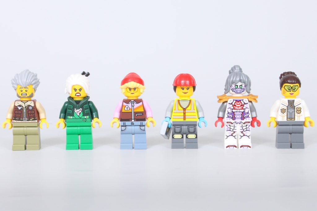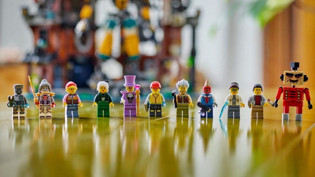 Poblando 71837 NINJAGO City Los talleres son la tarea de las 10 minifiguras incluidas. Como suele ocurrir en NINJAGO City En los sets, hay varios personajes exclusivos increíbles y algunos ciudadanos comunes para operar las tiendas, construir los mechas y limpiar las calles. Sin embargo, son las minifiguras exclusivas donde el set brilla, dividiendo el protagonismo entre la serie original de NINJAGO y Dragons Rising.