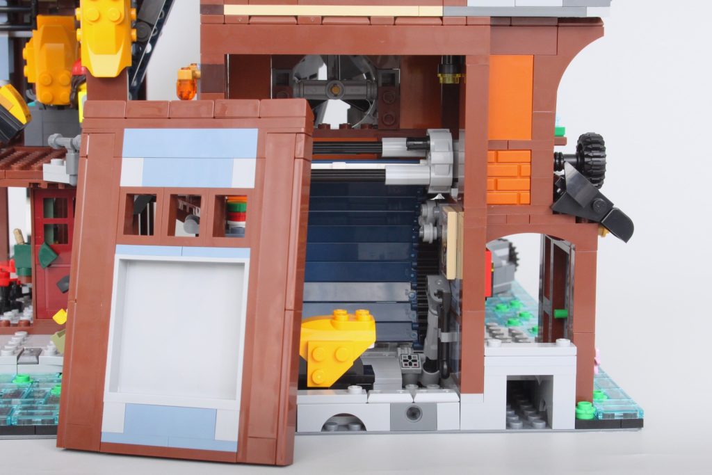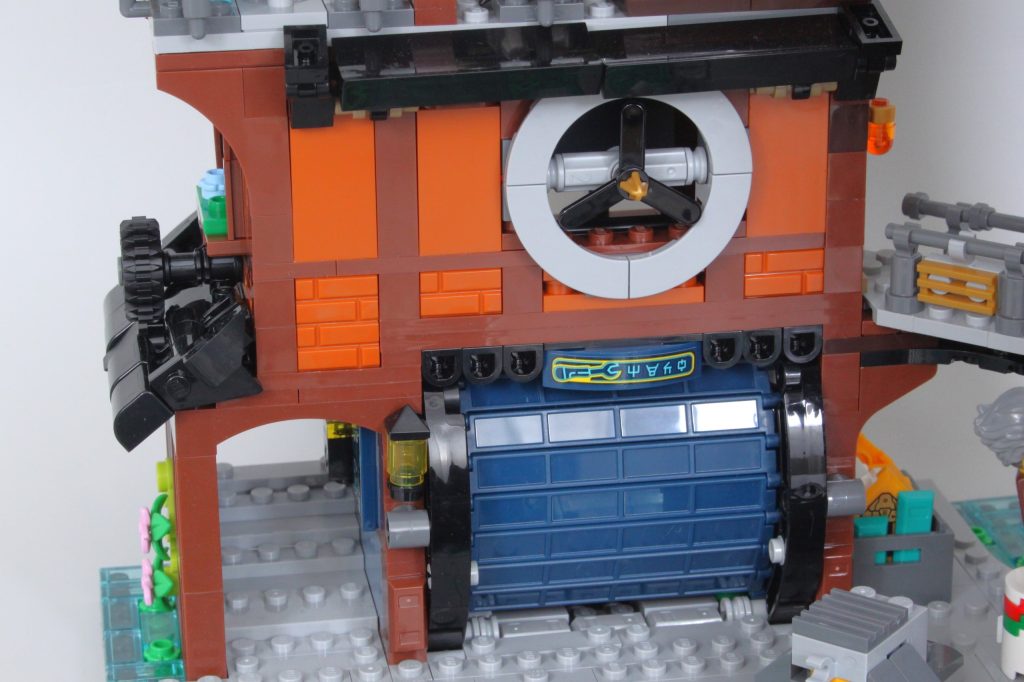 Lo que falta en el almacén, la zona del garaje lo compensa con una divertida función de juego con puerta enrollable, que muestra un increíble uso de las piezas y un exterior industrial que llama la atención de inmediato. Hay amplio espacio para colocar minifiguras arriba y abajo, al menos, y la versatilidad general de los elementos es tan excelente como siempre en NINJAGO. City.