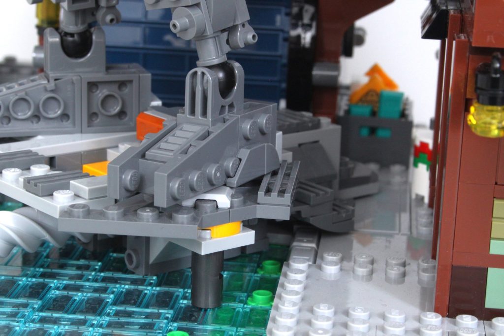 La grúa de este almacén está encajada en el techo y solo puede describirse como inoperante. A pesar de haber sido construida y reconstruida para asegurar su correcto ensamblaje, el mecanismo solo funciona al sujetar el dispositivo con los dedos, en lugar de usar las manivelas como se indica. Comparada con la grúa del tejado, es una función de juego frustrantemente disfuncional que ocupa mucho espacio en el módulo de la ciudad.