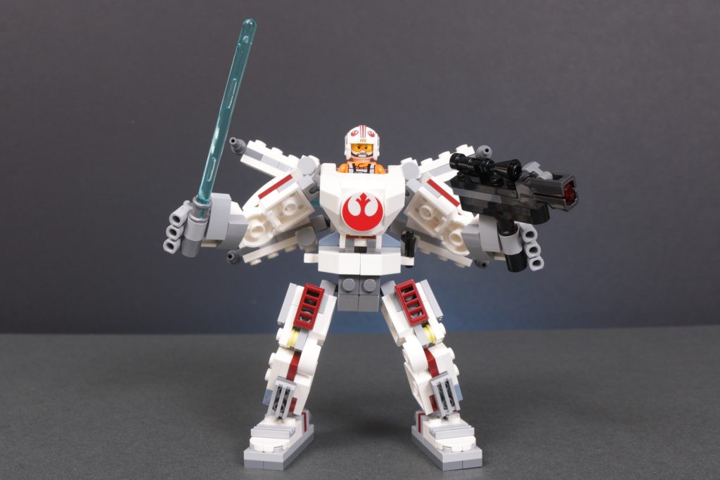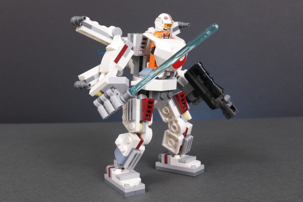 LEGO Star Wars 75390 Luke Skywalker X-Wing Mech sigue de cerca a 75368 Robot de Darth Vader, 75370 Stormtrooper Mech y 75369 Boba Fett mecánico, ofreciendo una minifigura bastante buena sentada dentro de un enorme, torpe, Ninjago-esque mech, en este caso completo con sable de luz y blaster