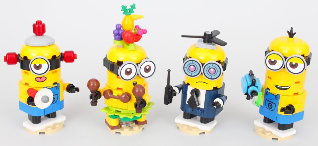 Los cuatro principales Minions Cada soporte se apoya en una placa circular que se puede desmontar y reorganizar alrededor del set a voluntad. Sus diseños funcionan tan bien que podrían servir como el debut de un LEGO. Minions Serie de figuras – similar a la de LEGO Super Mario – aunque es cierto que sus diseños se volverían obsoletos después de un tiempo.