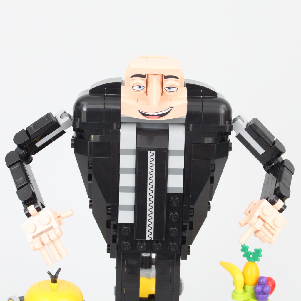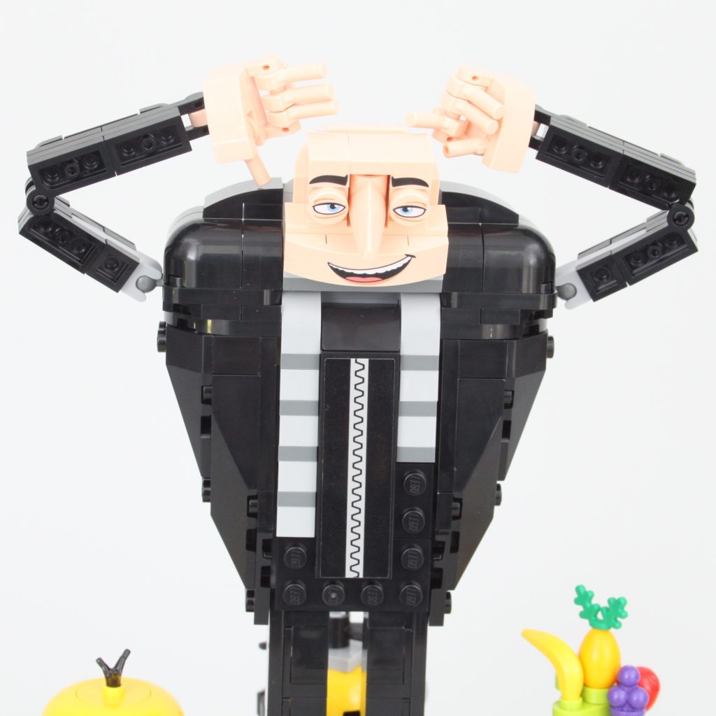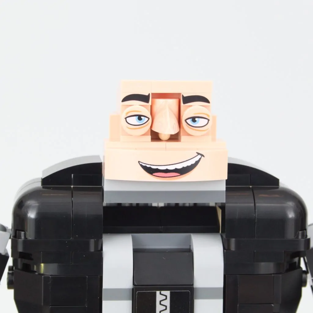 La cabeza de Gru es, sin duda, la parte más interesante del set. Es un excelente ejemplo de cómo se pueden usar elementos LEGO específicos de forma interesante y cómo la perspectiva también puede mejorar la apariencia de una construcción. Si bien quitarle una pieza de la espalda permite inclinar la cabeza hacia arriba, eliminando así la curvatura de Gru, los huecos alrededor de la nariz se hacen mucho más visibles. Es mejor dejarla y aceptar la curvatura tal como está diseñada oficialmente.