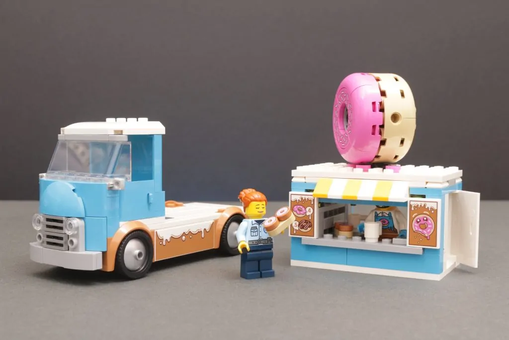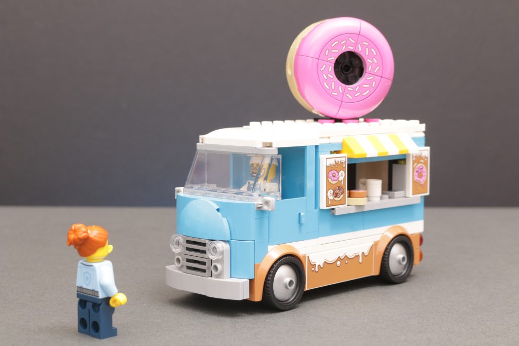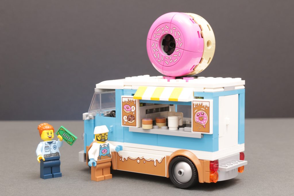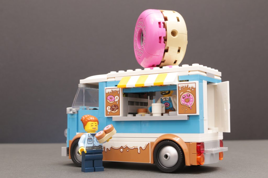 60452 Camión de donas Es sorprendentemente eficaz al lograr ese diseño de furgoneta clásica con pocas piezas, con una recomendación para mayores de 5 años, lo que minimiza muchos aspectos del set. Dicho esto, se cuenta una historia entre la furgoneta, su propietario y su único cliente. El compartimento de la furgoneta también es desmontable, lo que ofrece buenas opciones de juego si no quieres que un vehículo esté aparcado ilegalmente en tu ciudad LEGO.