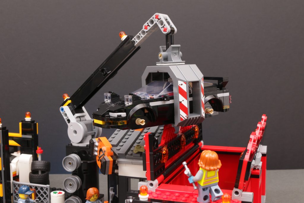 60472 Desguace con coches Es el conjunto más llamativo y gratificante de este LEGO en particular. City La gama se lanzará en enero de 2025 y competirá con los sets F1 y Space en cuanto a características y diversión. Se cuenta una historia completa en tres secciones a medida que avanzas en 60472: algunos autos rápidos y llamativos llegan al desguace y se conducen por la rampa para que se les corten las secciones delantera y trasera y se les quiten las ruedas, antes de colocarlos en el soporte elevado y la grúa en funcionamiento los recoge, los eleva sobre la oficina del desguace y los deja caer en la trituradora realmente grande.