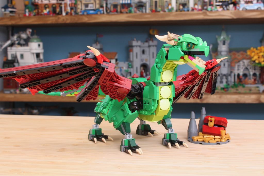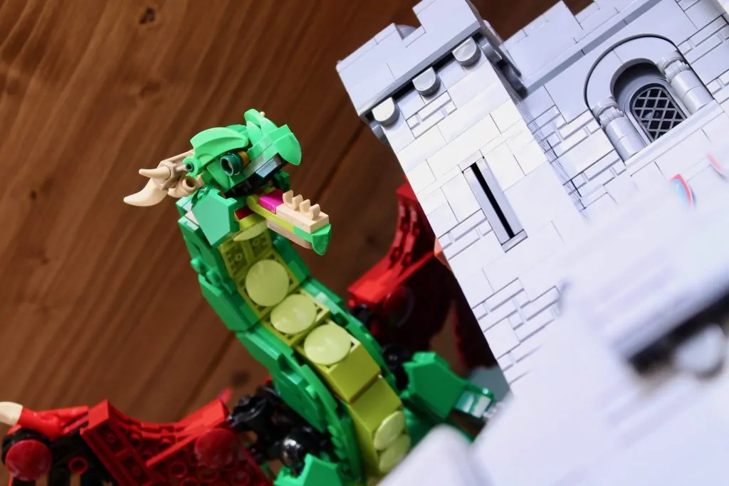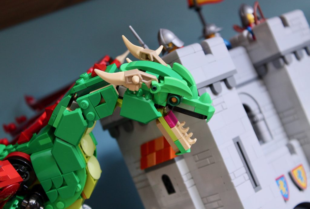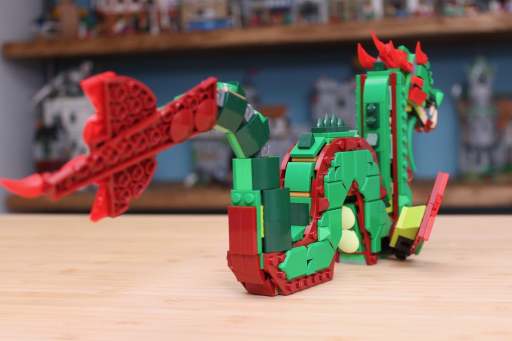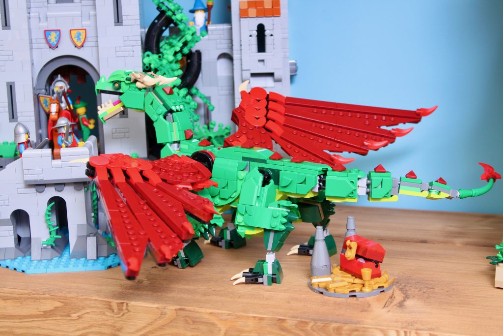 Canalizando OG LEGO La mascota Ollie, el dragón, a través de su paleta de colores rojo y verde intensos y brillantes, el modelo principal del Dragón Medieval 31161 toma todo lo que los diseñadores de LEGO han aprendido sobre los dragones, a lo largo de años de refinamiento e iteración de sus diseños en todos los temas, incluyendo Ninjago, Monkie Kid, Ninjago, Disney, Ninjago y (una vez más por si acaso) Ninjago – y los aplica a un clásico concepto de alta fantasía.