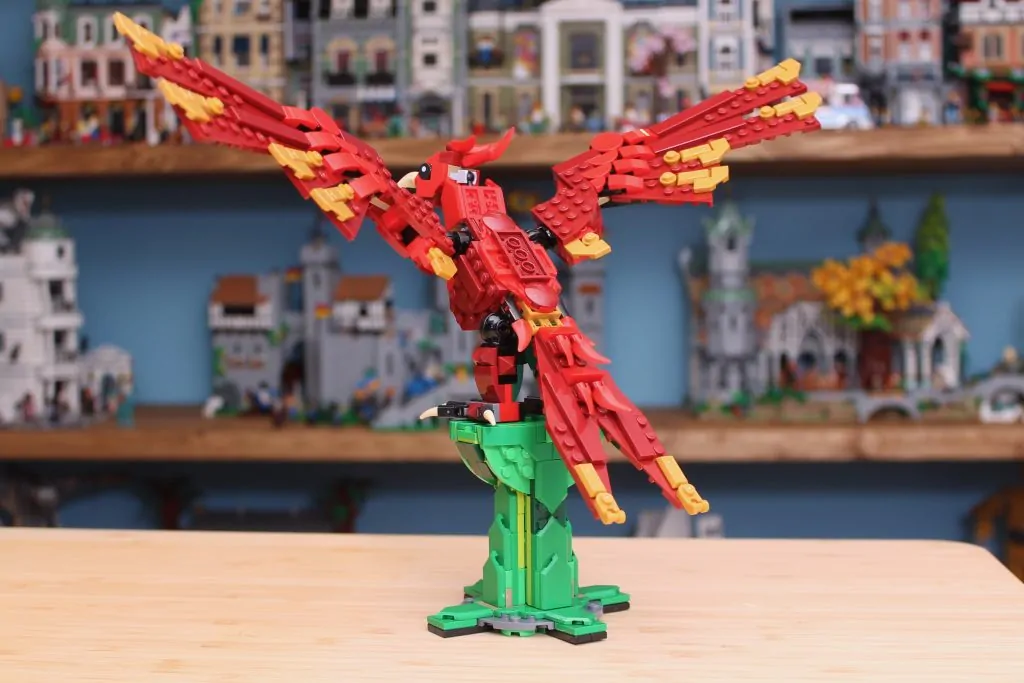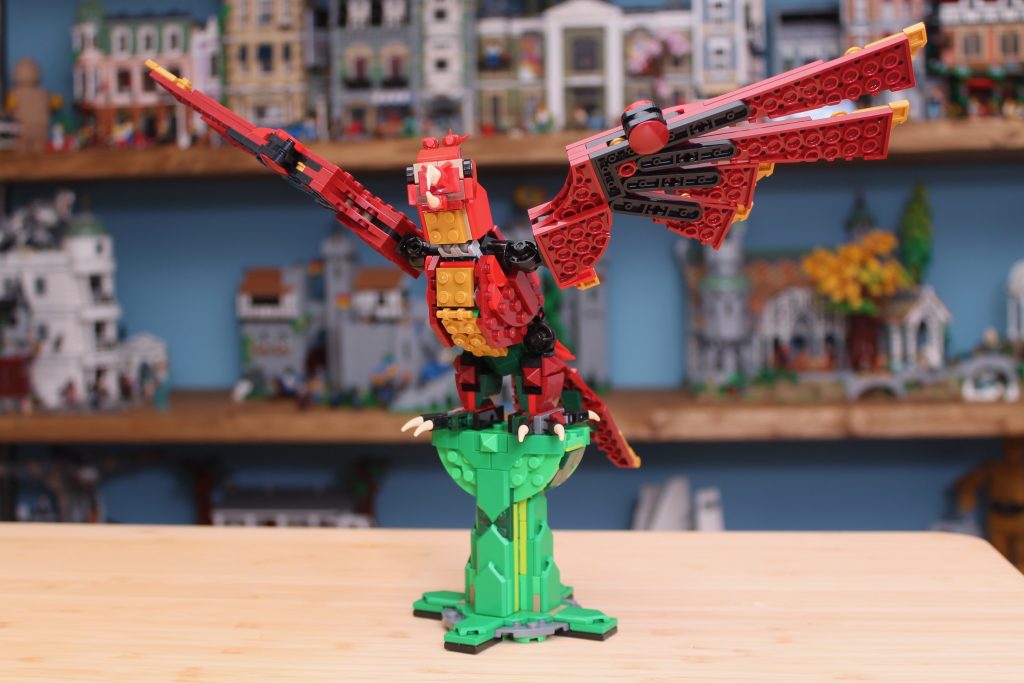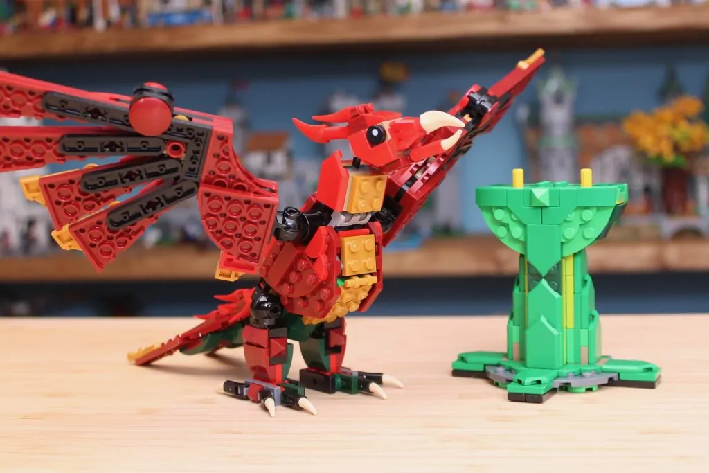 Lo más inusual de 31161 Medieval Dragon es que invierte casi por completo la paleta de colores en una de sus configuraciones alternativas. Mientras que el dragón es predominantemente verde con reflejos rojos, el fénix concentra esos elementos verdes en su peana, mientras que el ave se caracteriza por tonos rojizos y dorados. Esto demuestra la ingeniosidad de los diseñadores con estos sets, encontrando maneras de maximizar la paleta de colores y piezas para adaptarse a configuraciones cada vez más dispares.