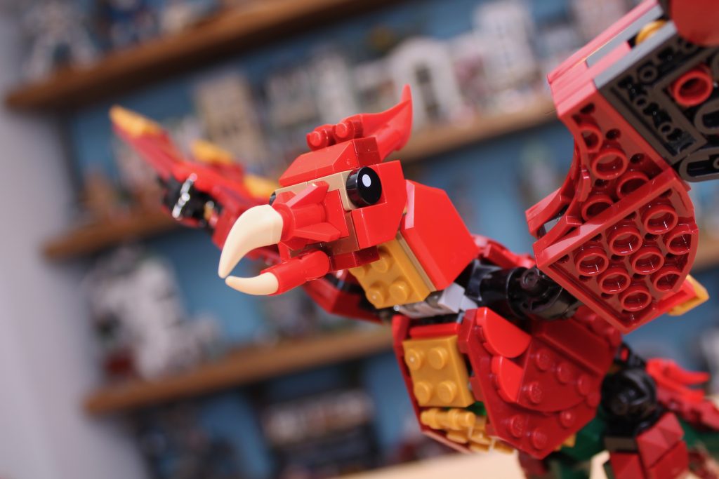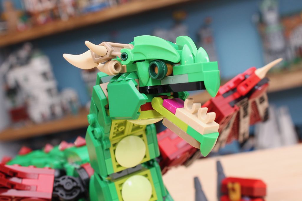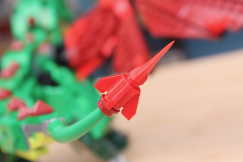 Pero la cabeza es un verdadero punto culminante, y sin duda la mejor de las tres versiones, ya que combina los clips del dragón con dientes reales para una mordida más feroz. Es una sección del modelo sorprendentemente pesada en general (lo que contribuye a la incapacidad de la rótula para soportar su peso), y aprovecha al máximo algunos de los elementos más inusuales que los diseñadores han logrado incluir en la selección de piezas de 31161 Medieval Dragon.