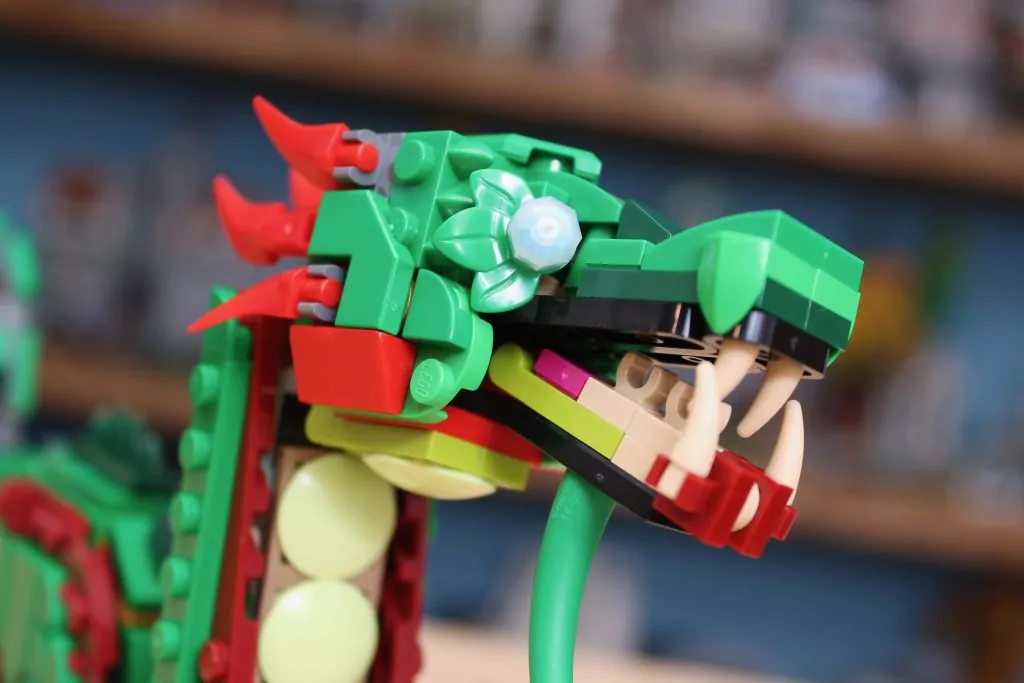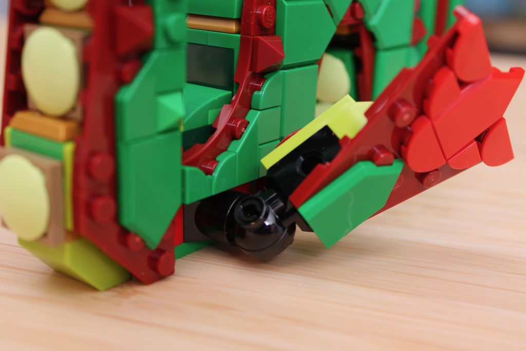 El modelado es bastante ingenioso en general, demostrando una vez más la destreza del equipo Creator al crear formas orgánicas con piezas relativamente comunes. Si hay algo que destacar es la cabeza, que es ingeniosa en ciertos aspectos (fíjense de nuevo en esos dientes sobre los ojos), pero, irónicamente, el uso de clips para los dientes no resulta tan amenazante como debería.