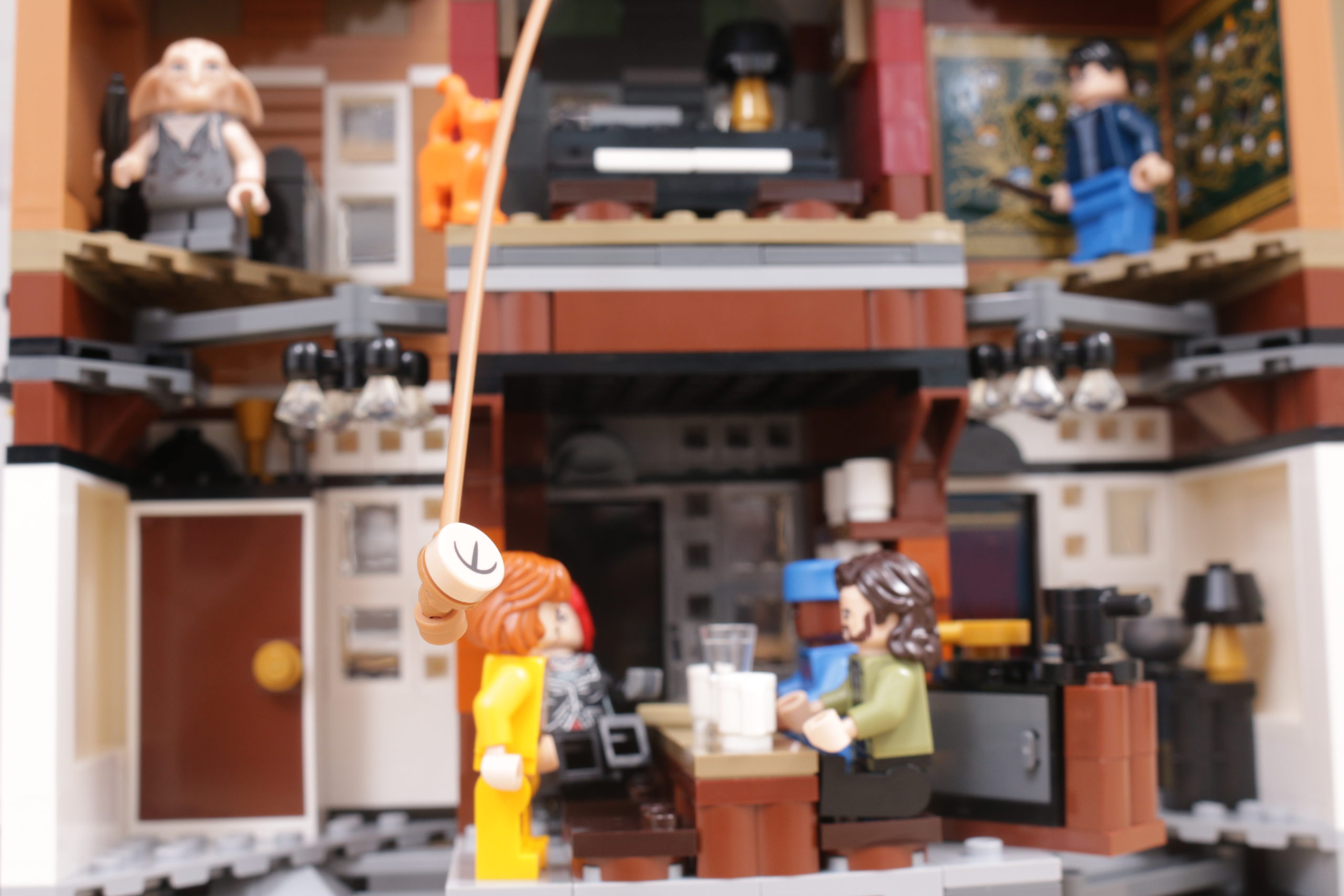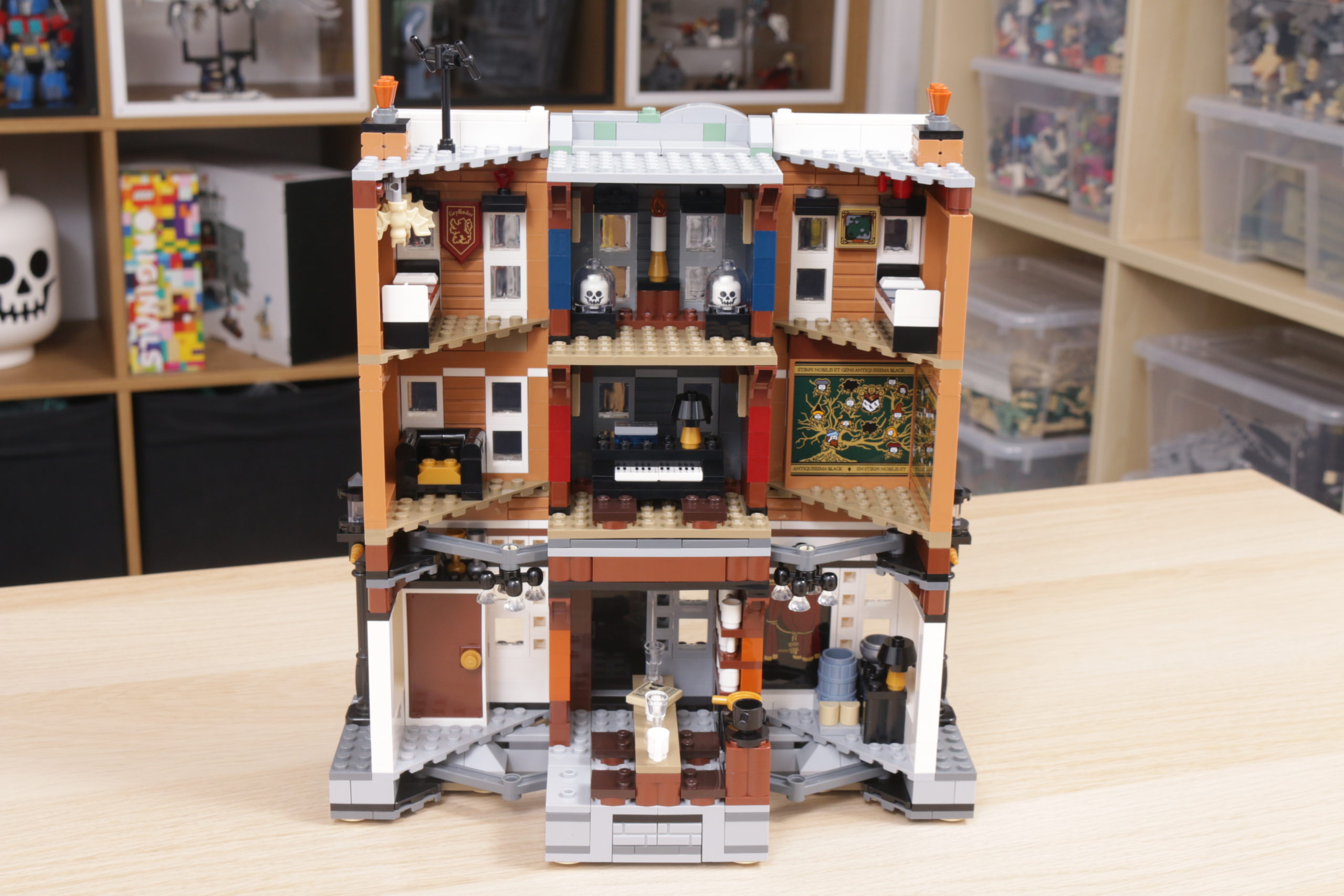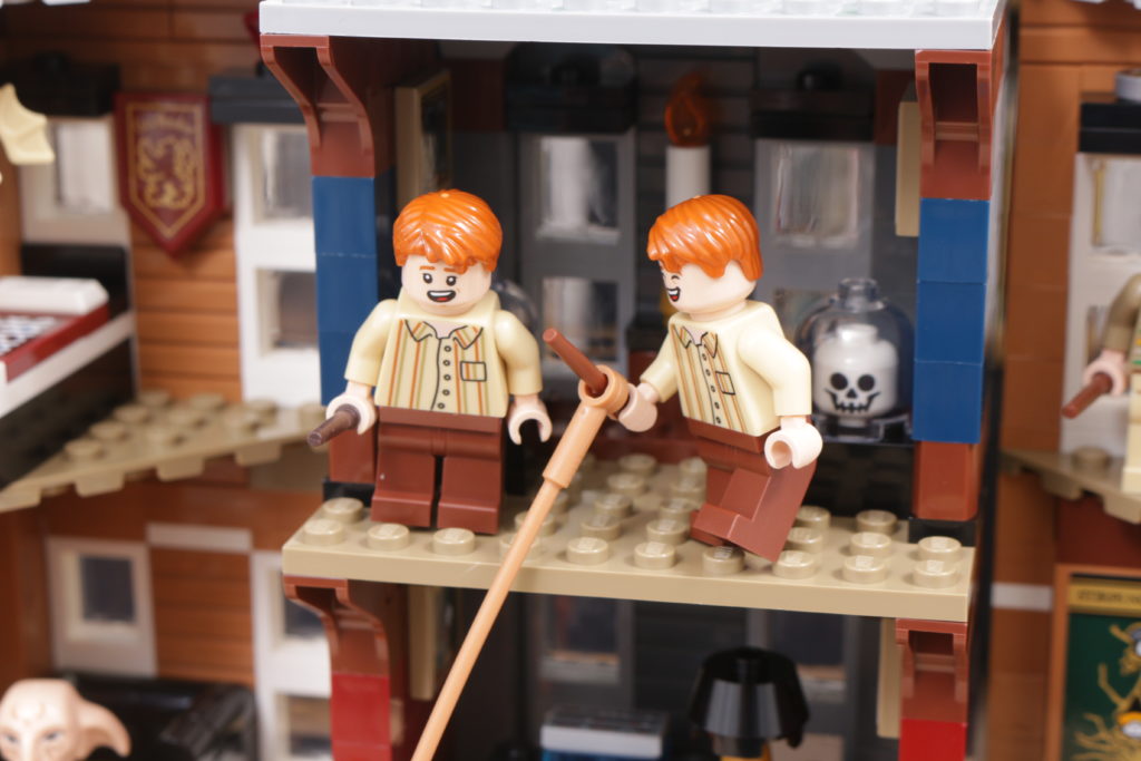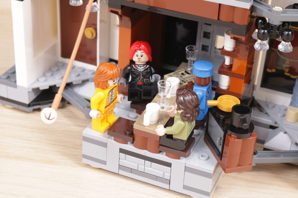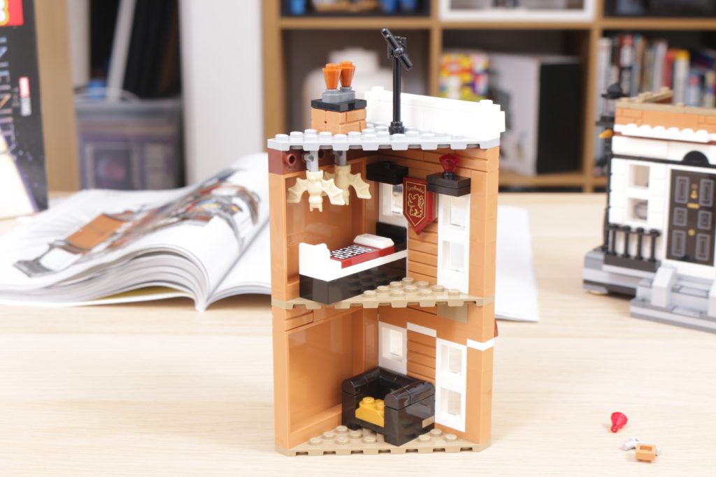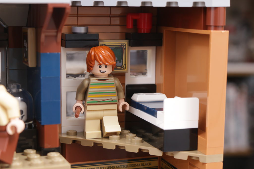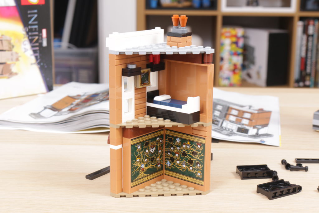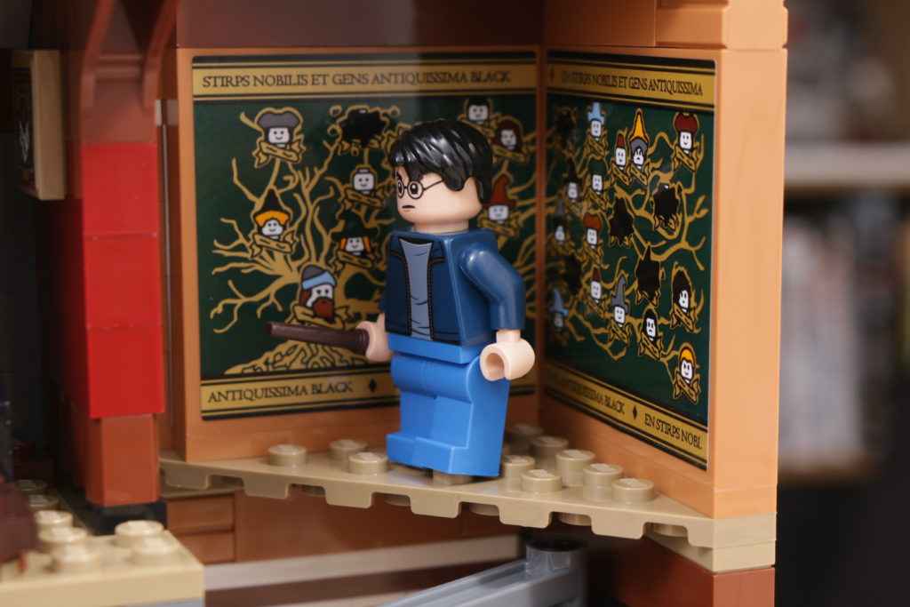 Este enfoque se extiende al interior del set, sobre todo en el tapiz del árbol genealógico de la familia Black, recreado con gran ingenio al más puro estilo LEGO en dos grandes pegatinas. La cocina de la planta baja, los dormitorios del tercer piso y los numerosos objetos dispersos, como esas pinturas espeluznantes, confieren al interior de la casa el carácter y la personalidad que evoca en la pantalla y en los libros. Las bases en ángulo, necesarias para plegar el interior cuando la casa se repliega hacia el interior, no deslumbra demasiado; de hecho, podrían acentuar la sensación de inseguridad, claustrofobia y sombríos que evocaba el número 12 de Grimmauld Place. Si falta algún detalle, sería algo que reflejara mejor el estado de abandono del lugar: objetos bajo las sábanas y telarañas en las esquinas dan una pista de cómo la casa estuvo desatendida durante 10 años antes del regreso de Sirius.