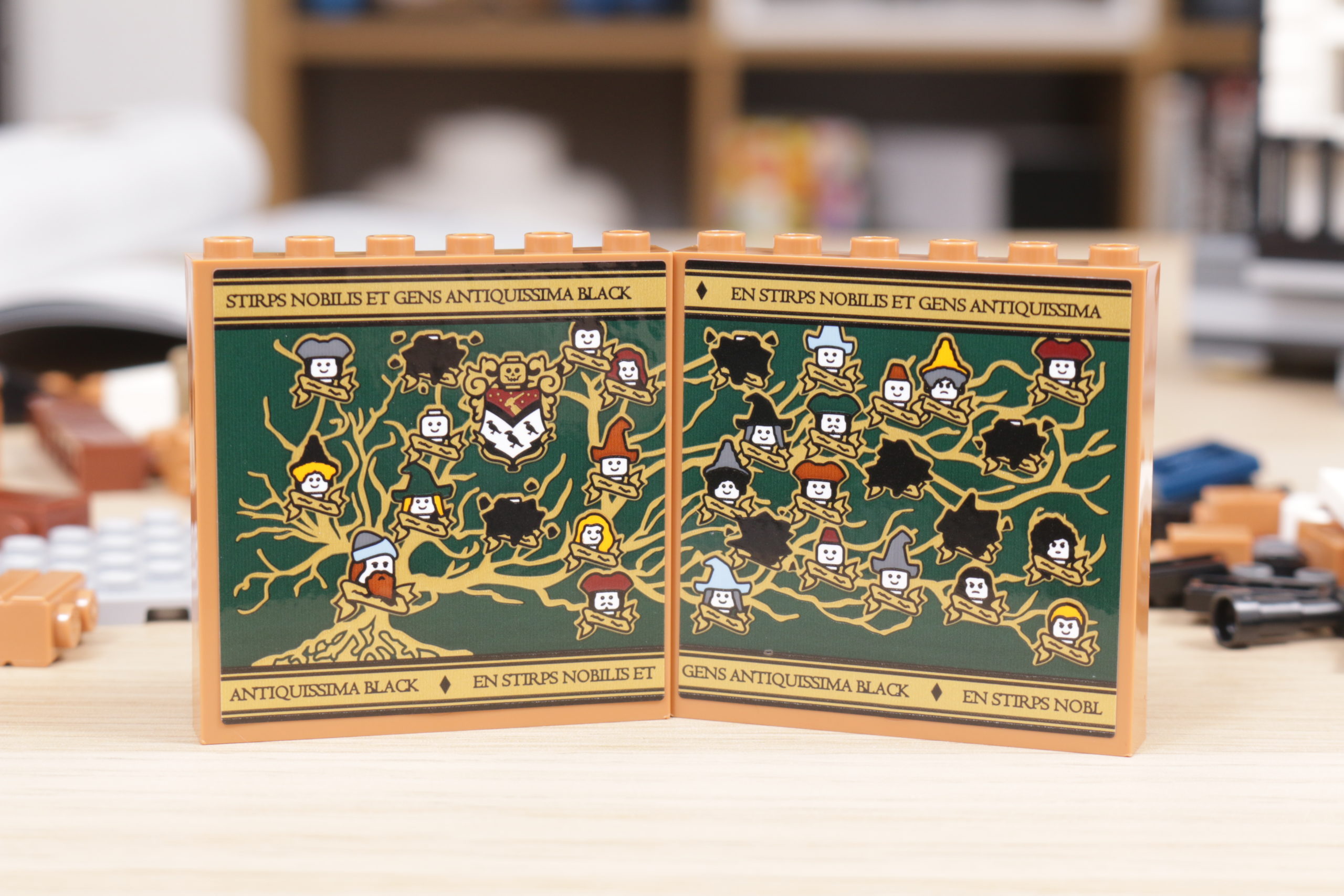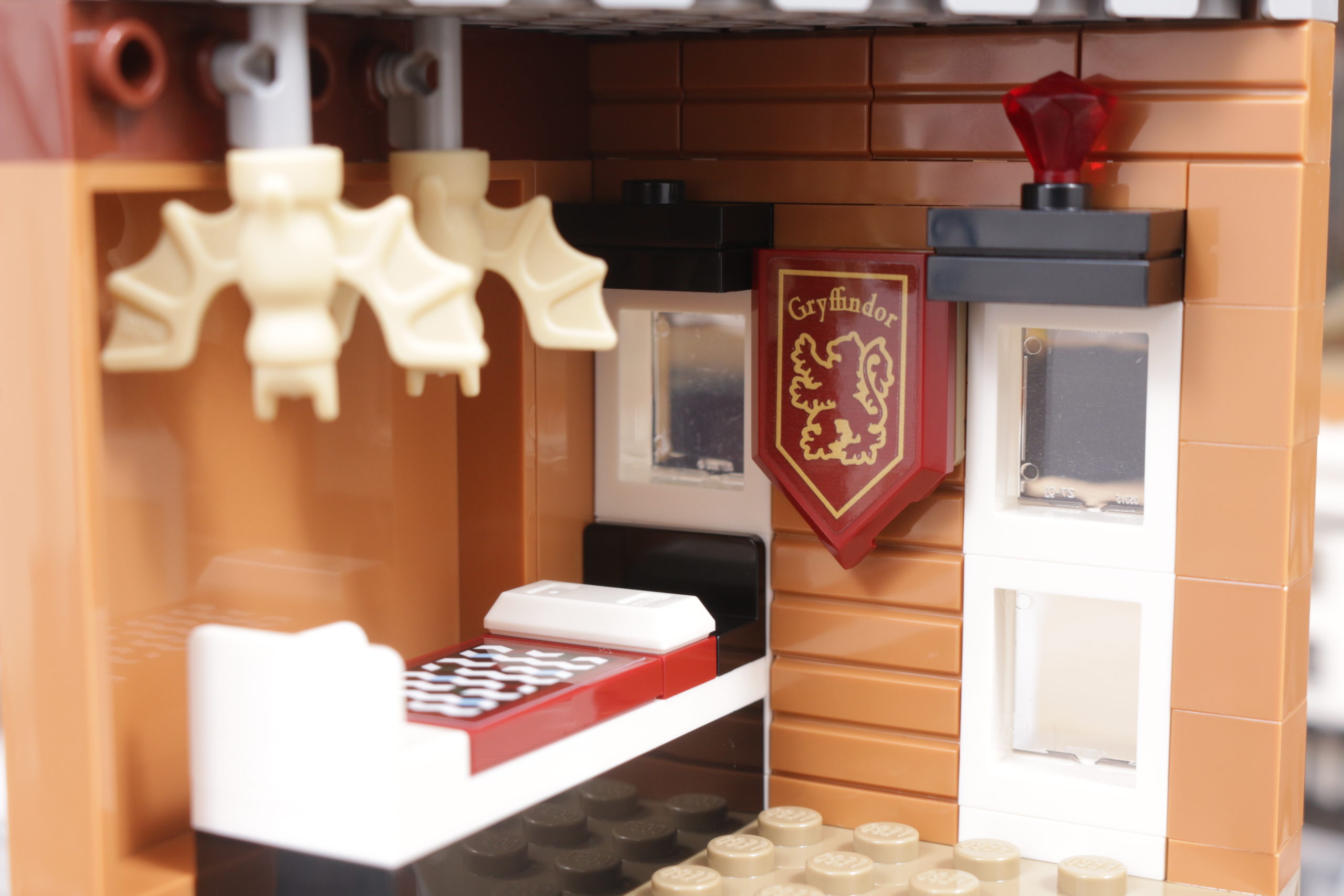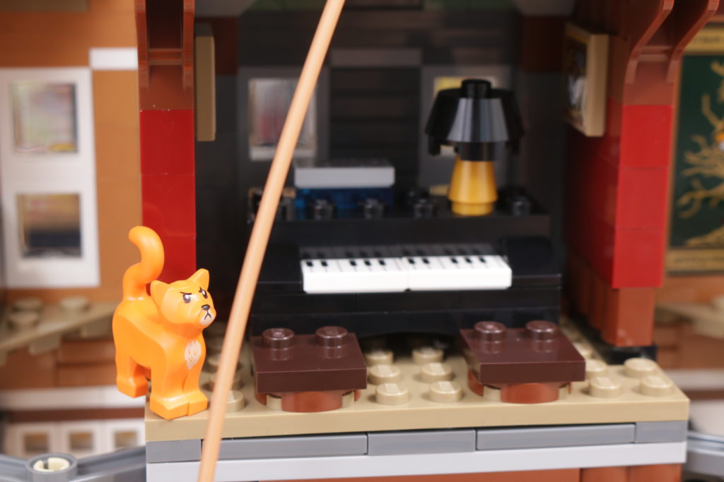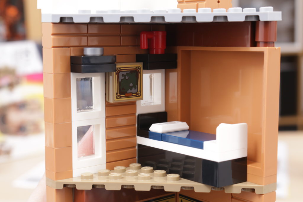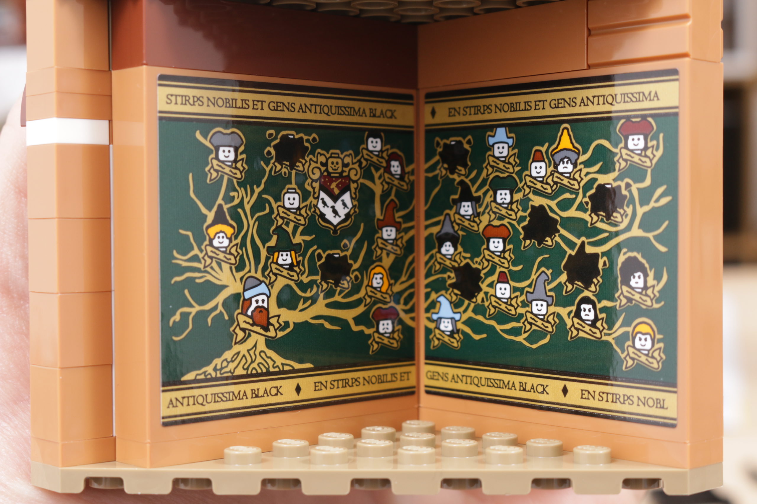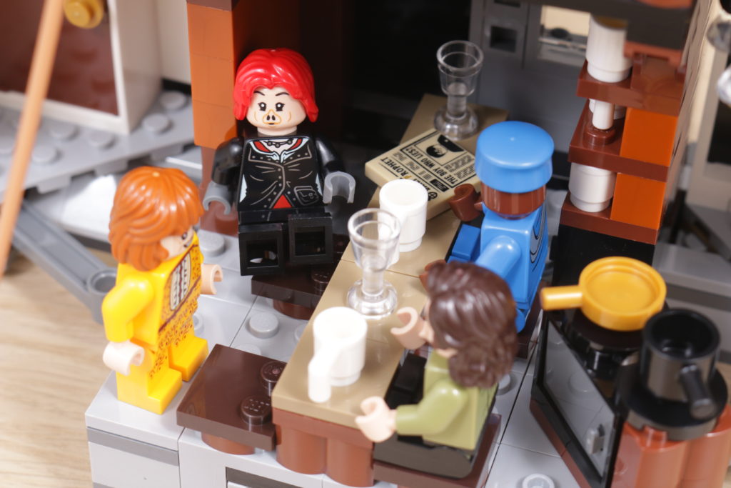 Este enfoque se extiende al interior del set, sobre todo en el tapiz del árbol genealógico de la familia Black, recreado con gran ingenio al más puro estilo LEGO en dos grandes pegatinas. La cocina de la planta baja, los dormitorios del tercer piso y los numerosos objetos dispersos, como esas pinturas espeluznantes, confieren al interior de la casa el carácter y la personalidad que evoca en la pantalla y en los libros. Las bases en ángulo, necesarias para plegar el interior cuando la casa se repliega hacia el interior, no deslumbra demasiado; de hecho, podrían acentuar la sensación de inseguridad, claustrofobia y sombríos que evocaba el número 12 de Grimmauld Place. Si falta algún detalle, sería algo que reflejara mejor el estado de abandono del lugar: objetos bajo las sábanas y telarañas en las esquinas dan una pista de cómo la casa estuvo desatendida durante 10 años antes del regreso de Sirius.