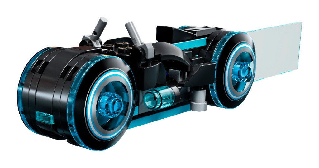 • La bicicleta ligera de Sam Flynn cuenta con un asiento para una minifigura, características auténticas y una variedad de elementos de estilo de luz azul translúcido, incluidos efectos de flujo de energía.