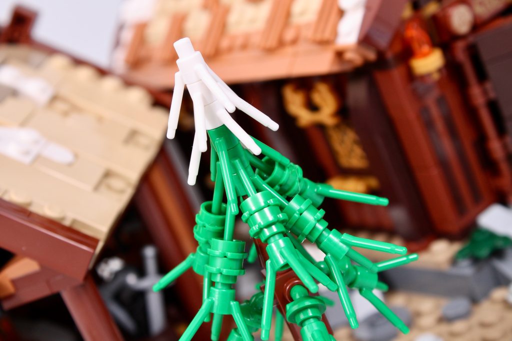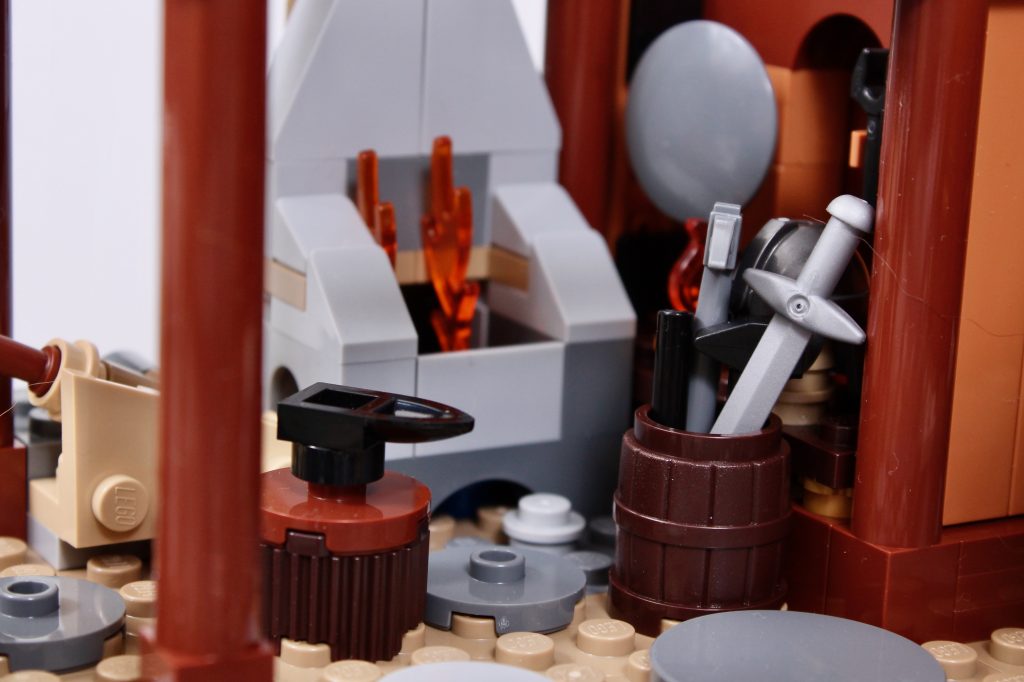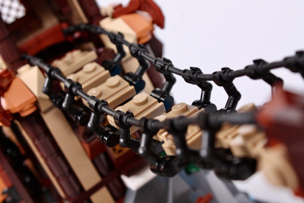 La construcción nunca se vuelve aburrida en las 15 bolsas, y eso se debe principalmente a esa relación precio por pieza tan atractiva. El LEGO Group ha logrado meter 2,103 piezas en la caja por solo £ 124.99 / $ 129.99 / € 139.99 porque muchas de ellas son relativamente pequeñas, y eso hace que la experiencia de construcción sea tan complicada como detallada. Armar cada una de estas estructuras parece novedoso, desde la forja que escupe llamas del herrero hasta el nuevo enfoque del puente de cuerda, que hace un buen uso de los elementos de correas rígidas relativamente recientes.