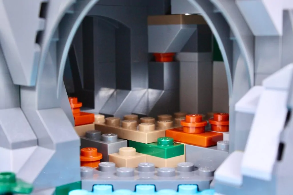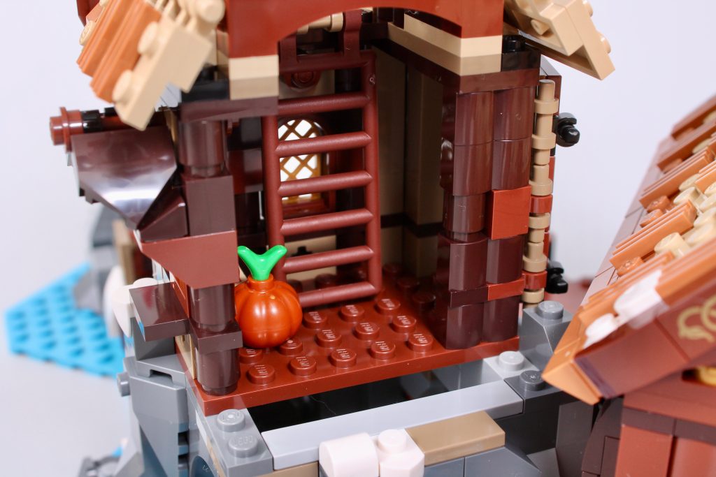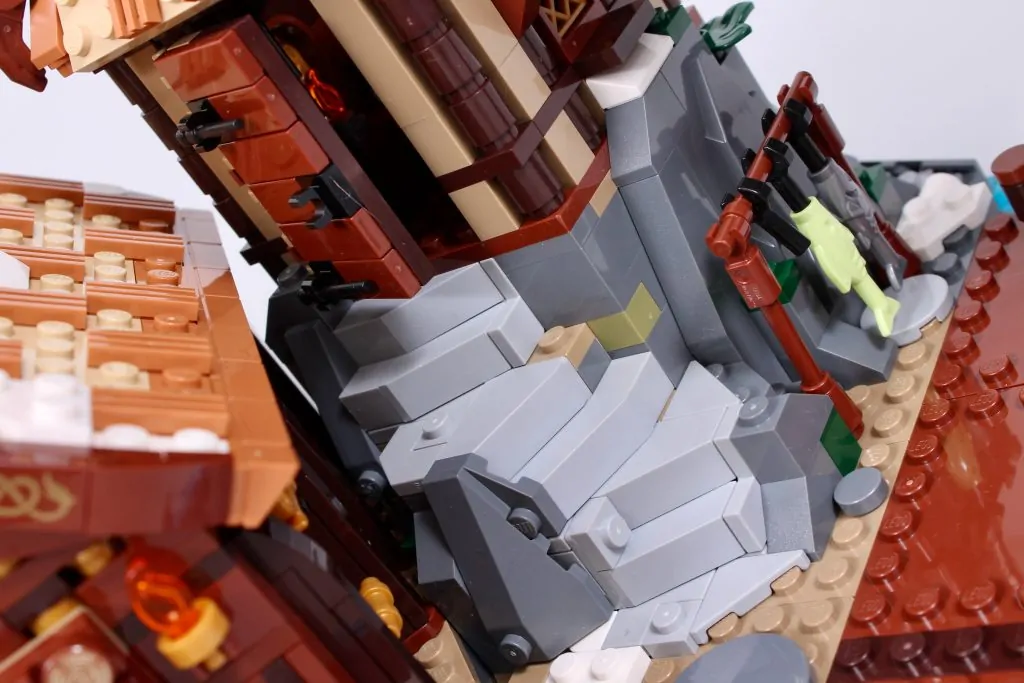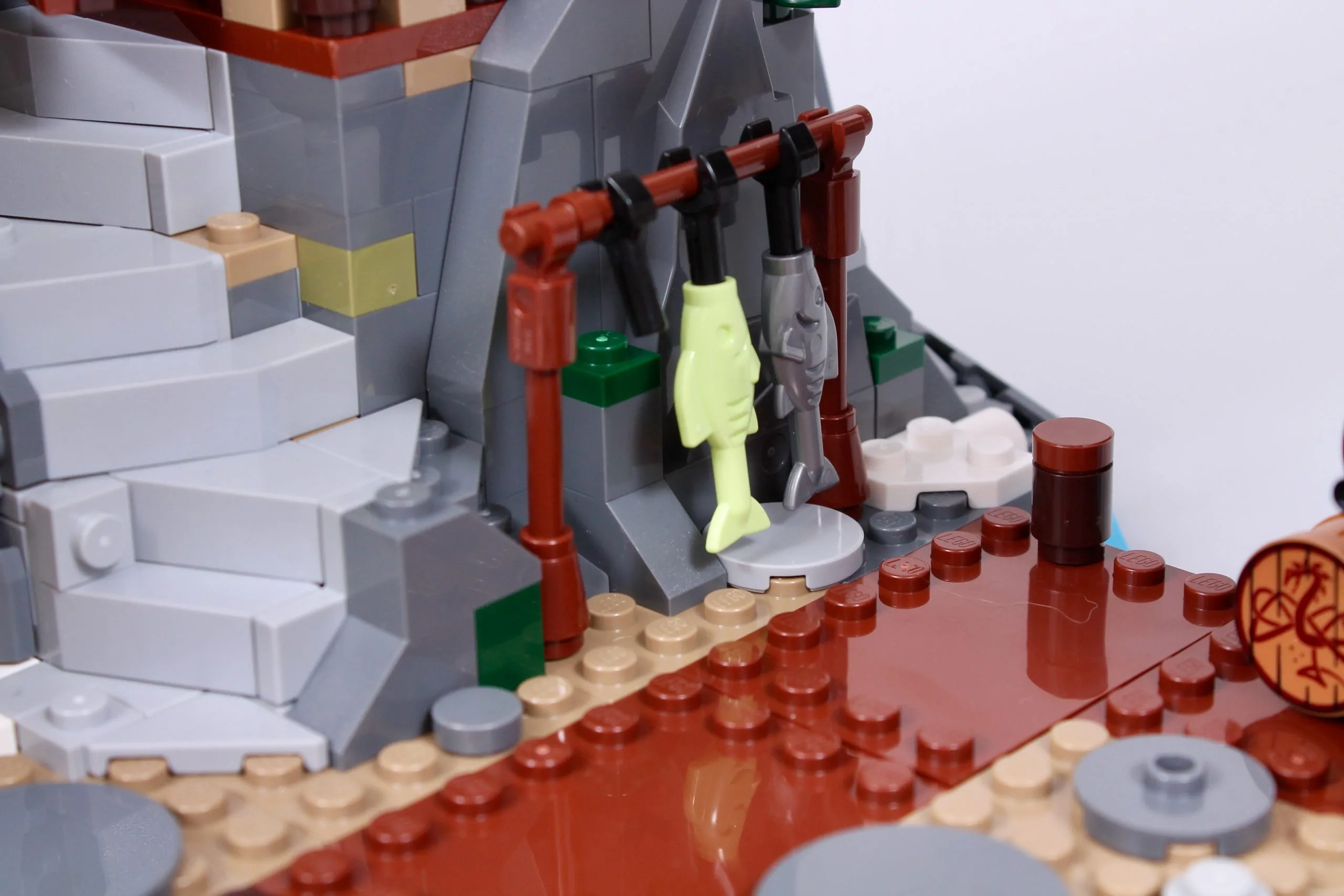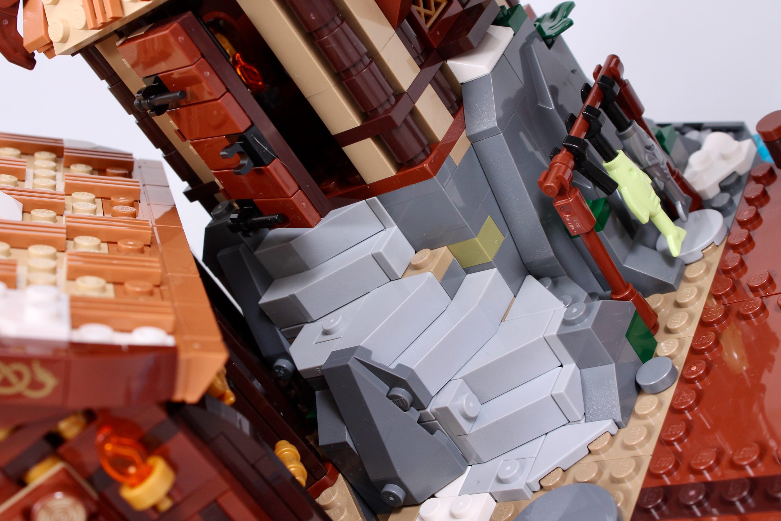 Lo más impresionante de 21343 Viking Village es cómo LEGO Group ha logrado combinar con tanto éxito las dos estéticas distintas de estos diseños, porque si bien el modelo terminado es sin duda más vibrante que el proyecto que acumuló todos esos votos en el LEGO Ideas x Encuesta de Target, todavía se siente firme. El indicio del clima invernal ayuda allí, pero también lo hace el resto de rocas alrededor de la base. No es tan frecuente como lo era en el proyecto original, pero es mucho mejor para mantener la construcción atractiva, y el equipo de diseño ha prestado atención donde cuenta, como la cueva debajo de la torre de vigilancia, que agrega interés en la parte trasera de la modelo.