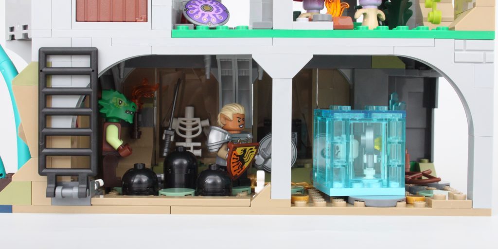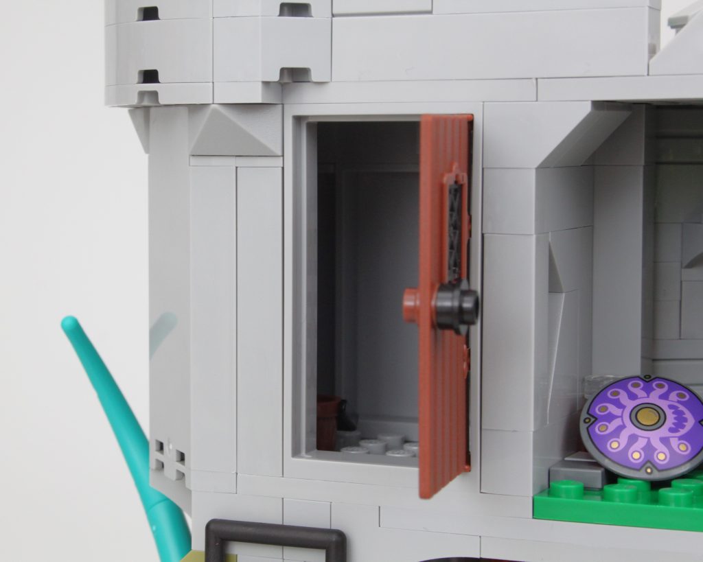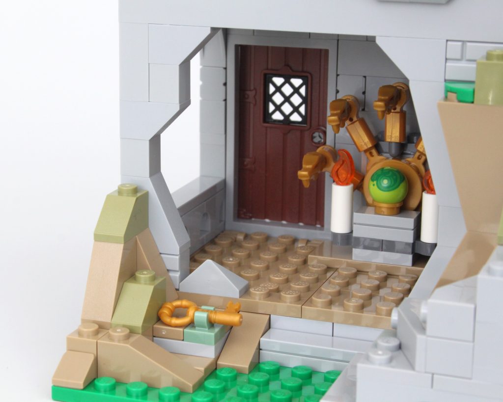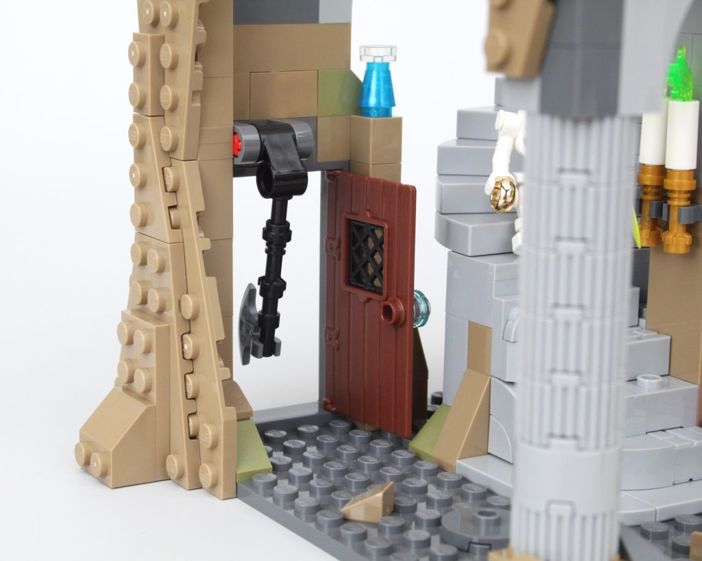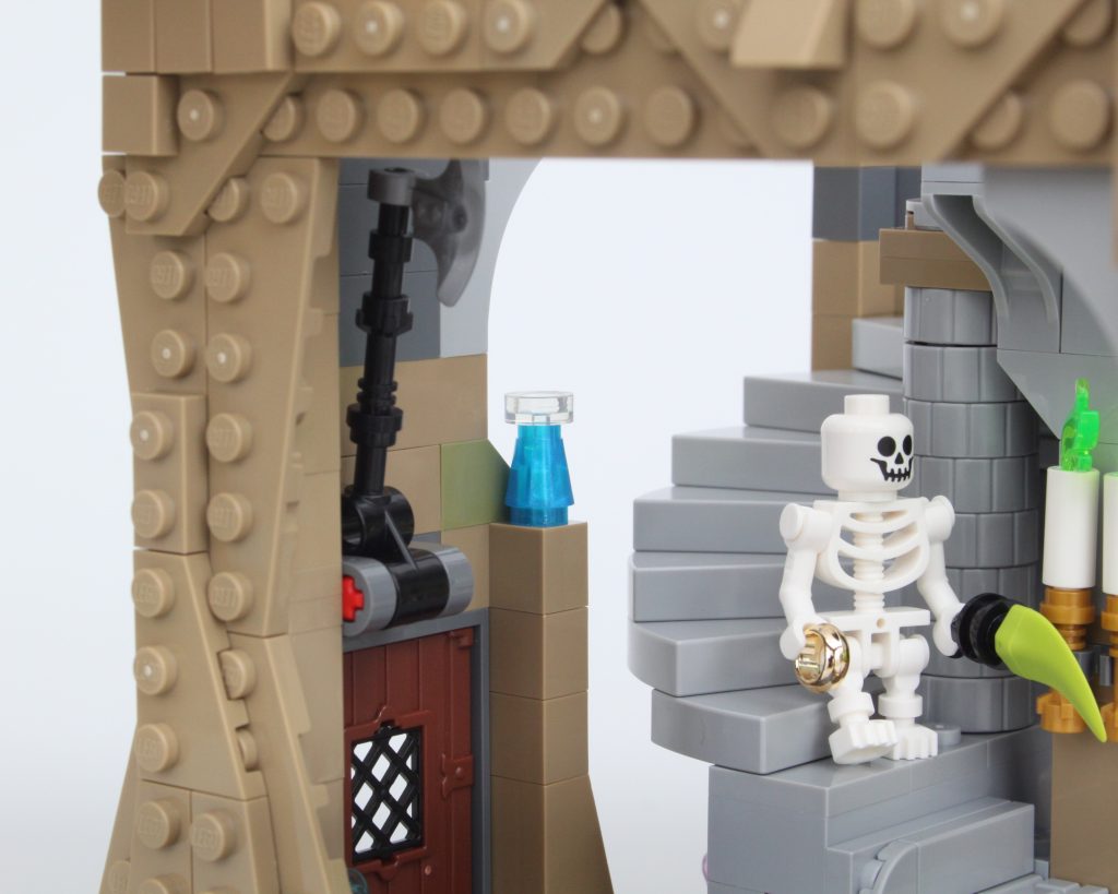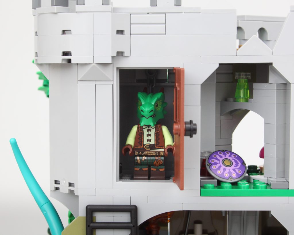 Es solo uno de los muchos elementos impresos fantásticos del conjunto que sin duda te sentirás tentado a buscar personajes personalizados, como estaba previsto. En esta área también hay una pequeña celda para guardar la minifigura verde de Dragonborn. El espacio interior es más detallado de lo que cabría esperar, aunque no se puede ver mucho el interior a través de la nueva puerta medieval. Colocar una minifigura en el interior es bastante fácil, pero sería bueno poder llegar más lejos en el espacio.