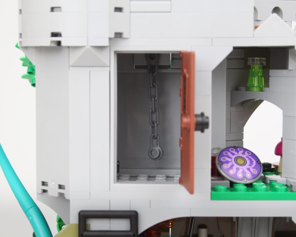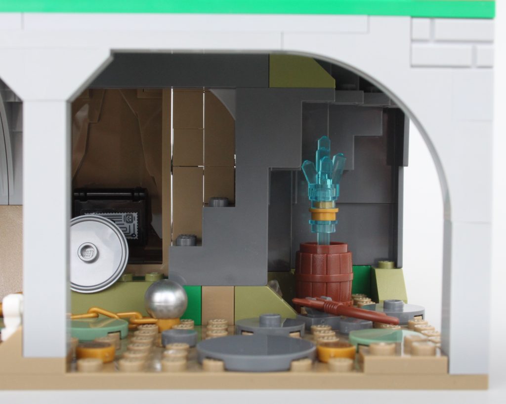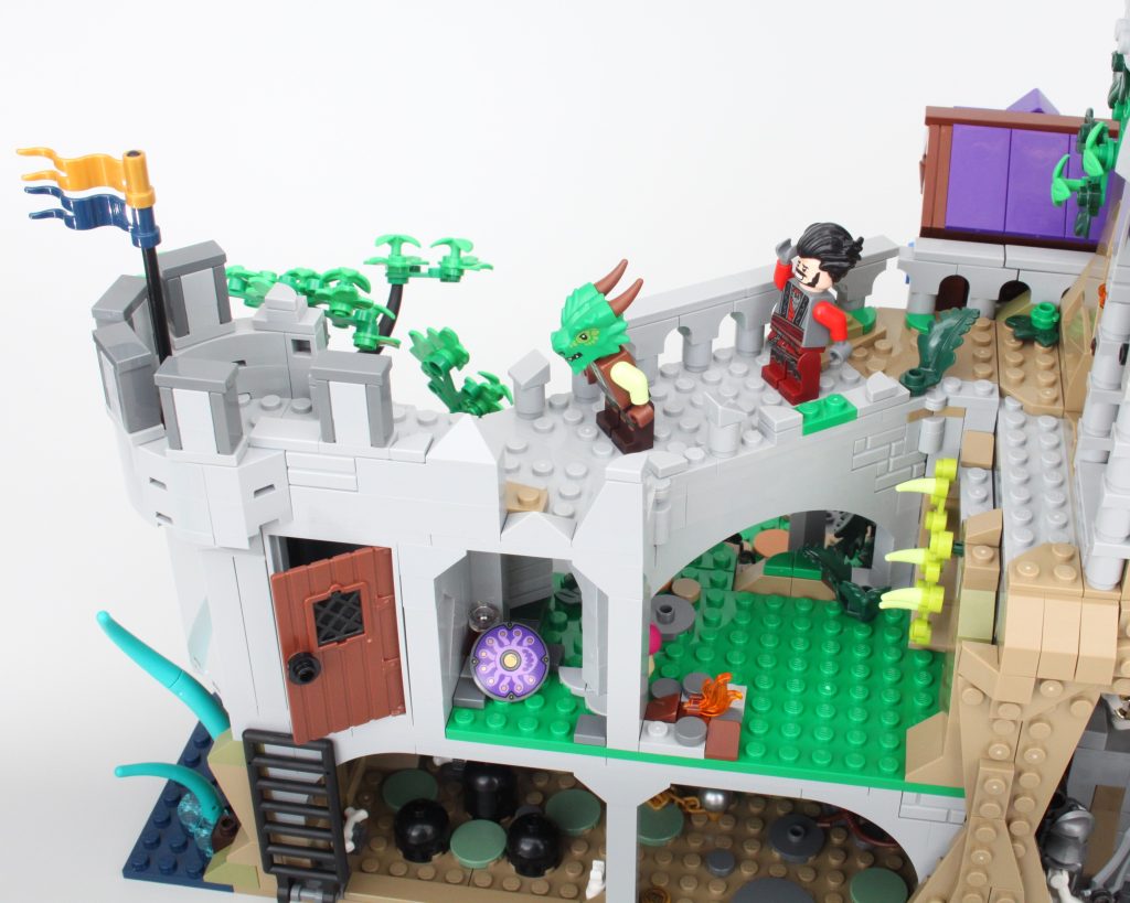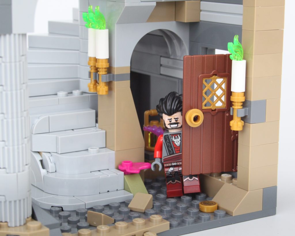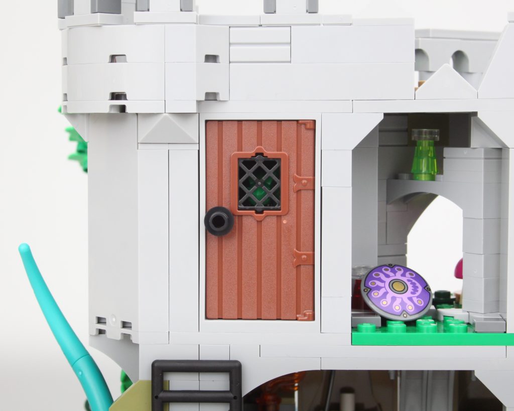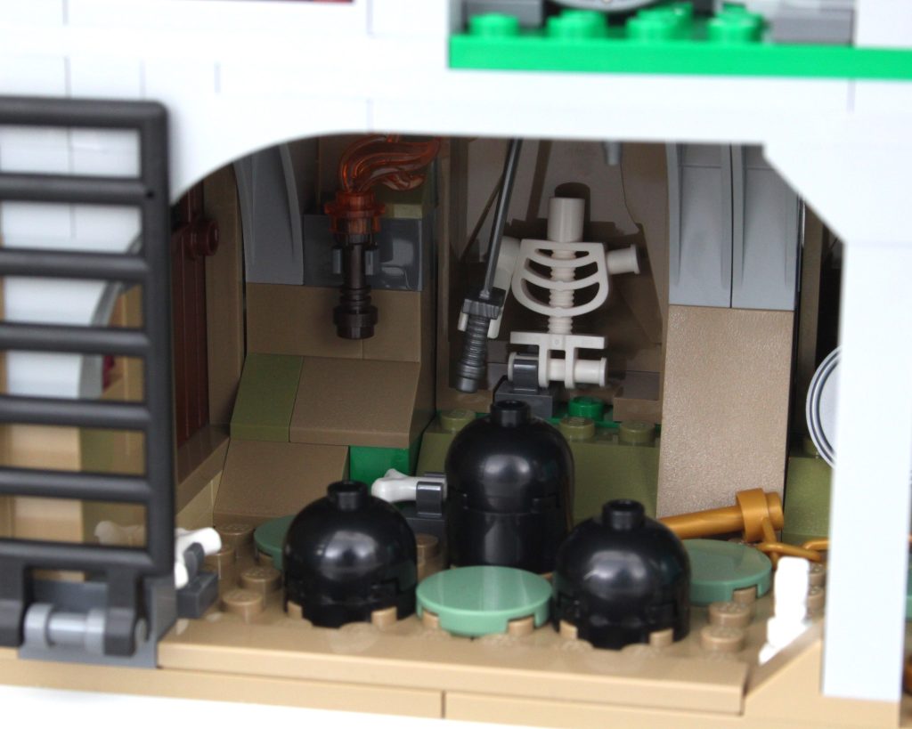 Es solo uno de los muchos elementos impresos fantásticos del conjunto que sin duda te sentirás tentado a buscar personajes personalizados, como estaba previsto. En esta área también hay una pequeña celda para guardar la minifigura verde de Dragonborn. El espacio interior es más detallado de lo que cabría esperar, aunque no se puede ver mucho el interior a través de la nueva puerta medieval. Colocar una minifigura en el interior es bastante fácil, pero sería bueno poder llegar más lejos en el espacio.