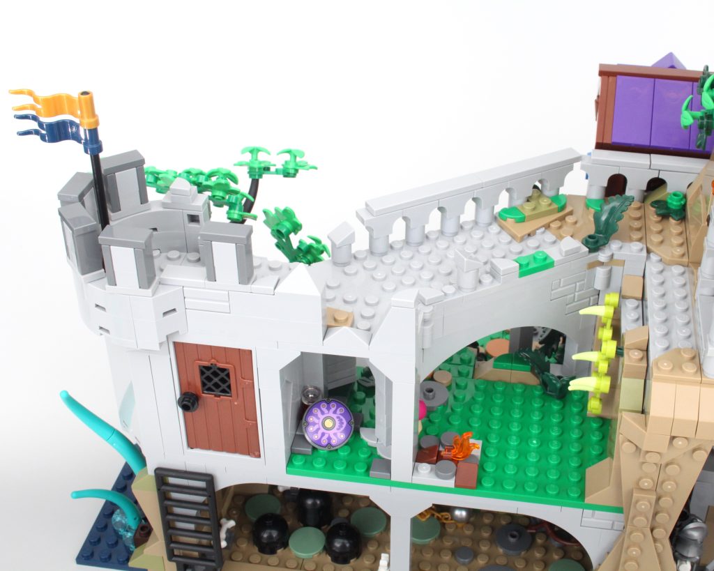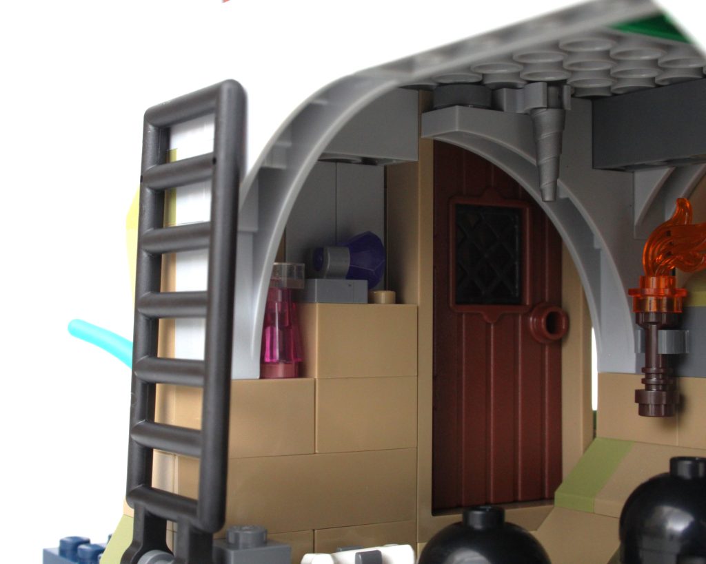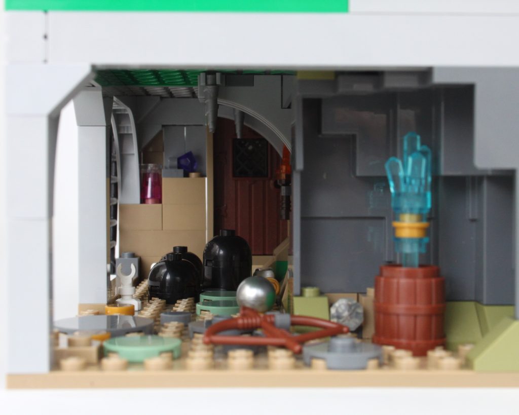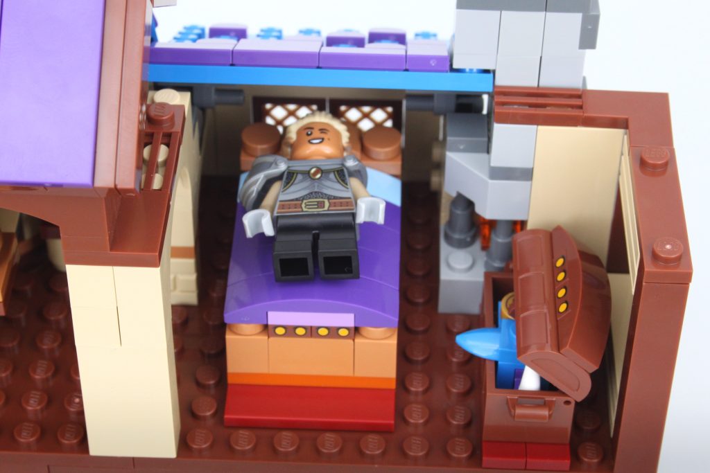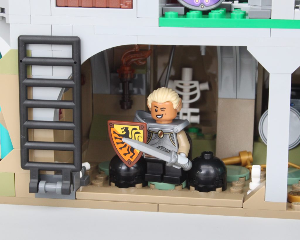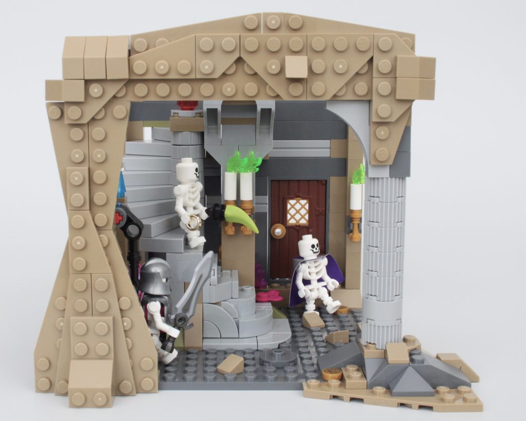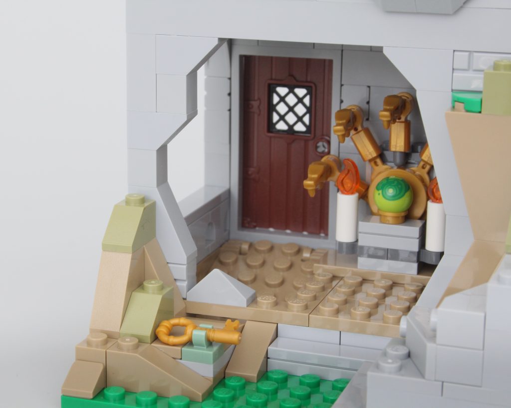 Es solo uno de los muchos elementos impresos fantásticos del conjunto que sin duda te sentirás tentado a buscar personajes personalizados, como estaba previsto. En esta área también hay una pequeña celda para guardar la minifigura verde de Dragonborn. El espacio interior es más detallado de lo que cabría esperar, aunque no se puede ver mucho el interior a través de la nueva puerta medieval. Colocar una minifigura en el interior es bastante fácil, pero sería bueno poder llegar más lejos en el espacio.