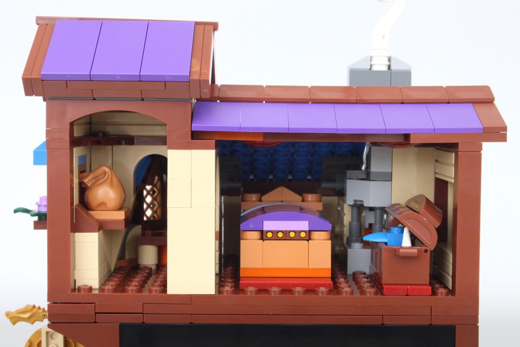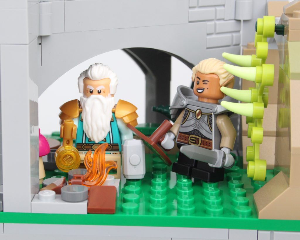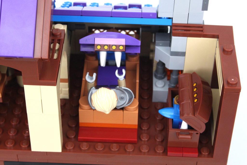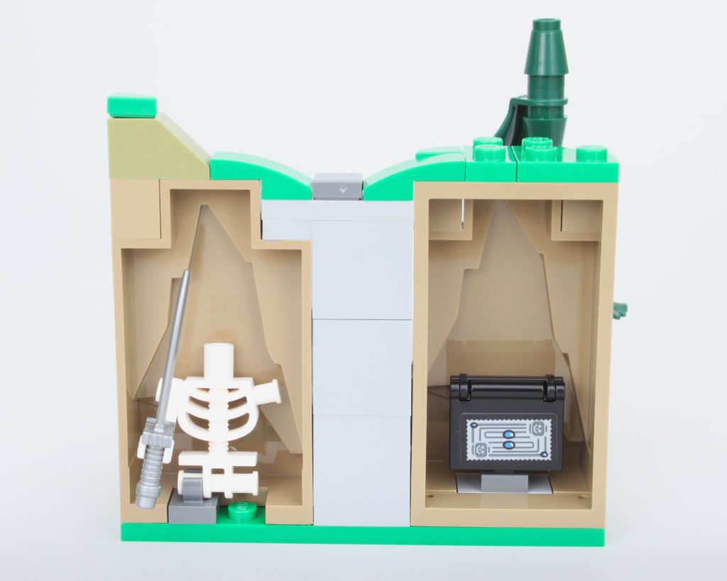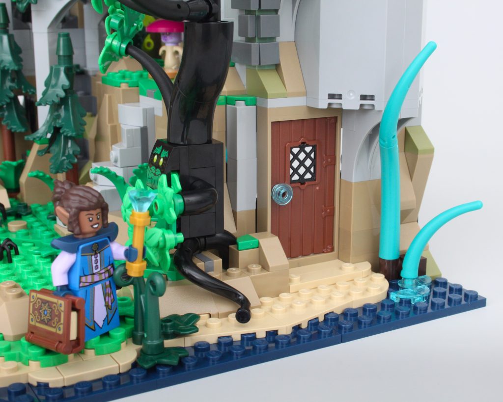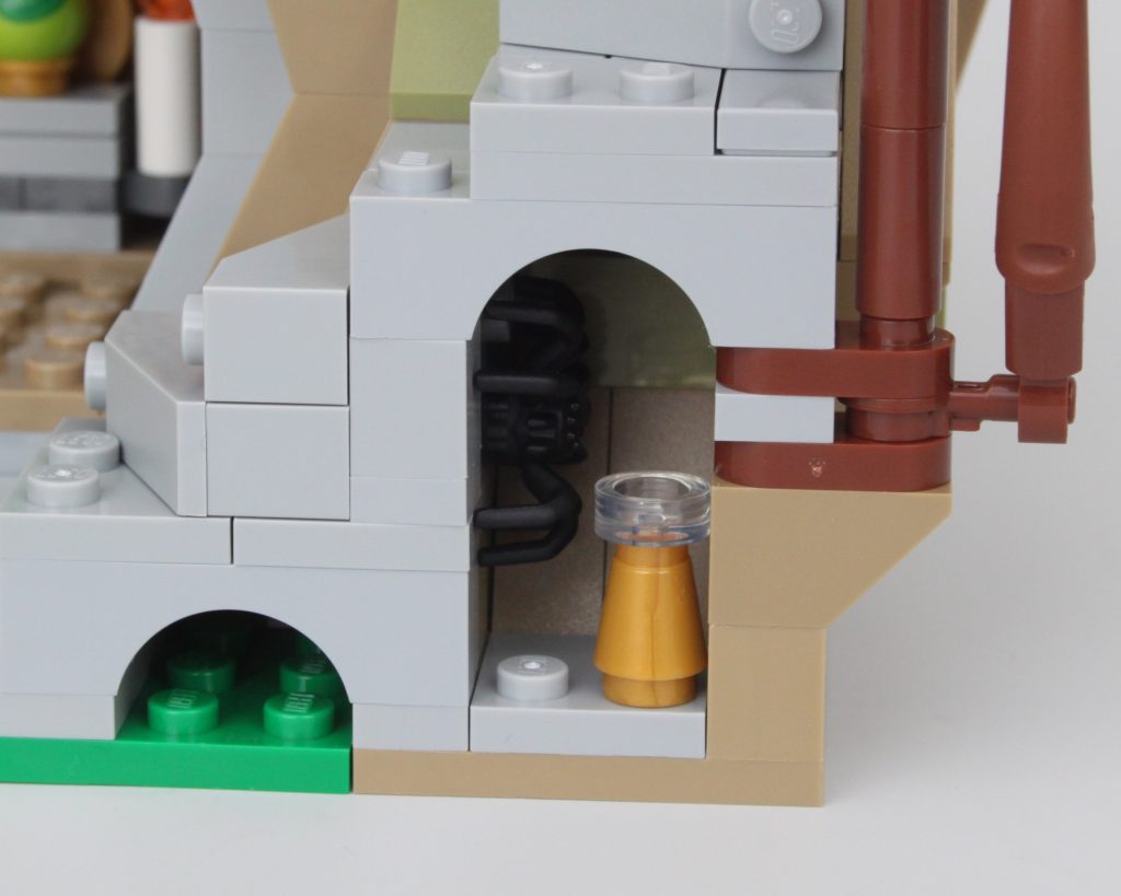 Es solo uno de los muchos elementos impresos fantásticos del conjunto que sin duda te sentirás tentado a buscar personajes personalizados, como estaba previsto. En esta área también hay una pequeña celda para guardar la minifigura verde de Dragonborn. El espacio interior es más detallado de lo que cabría esperar, aunque no se puede ver mucho el interior a través de la nueva puerta medieval. Colocar una minifigura en el interior es bastante fácil, pero sería bueno poder llegar más lejos en el espacio.