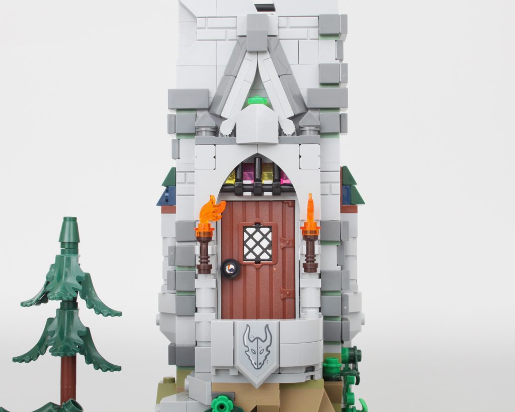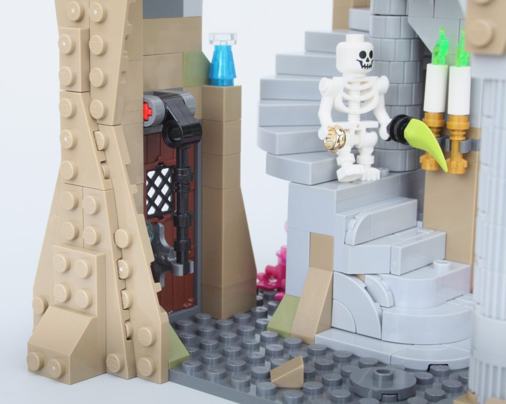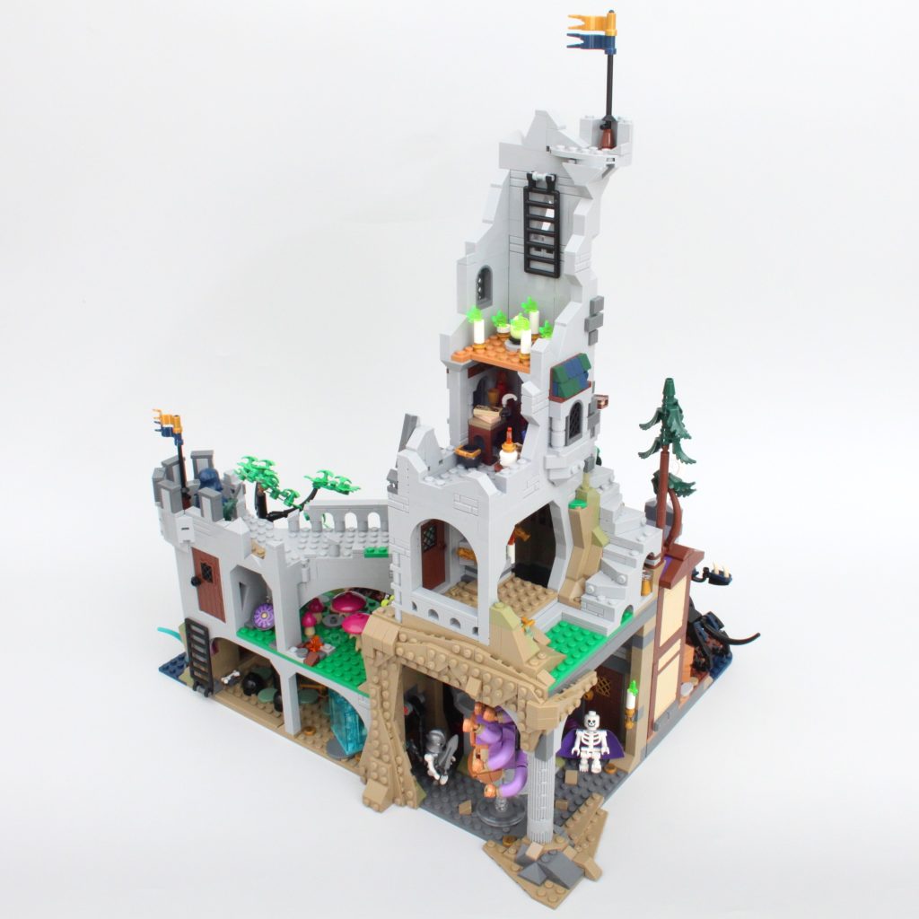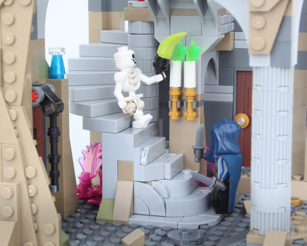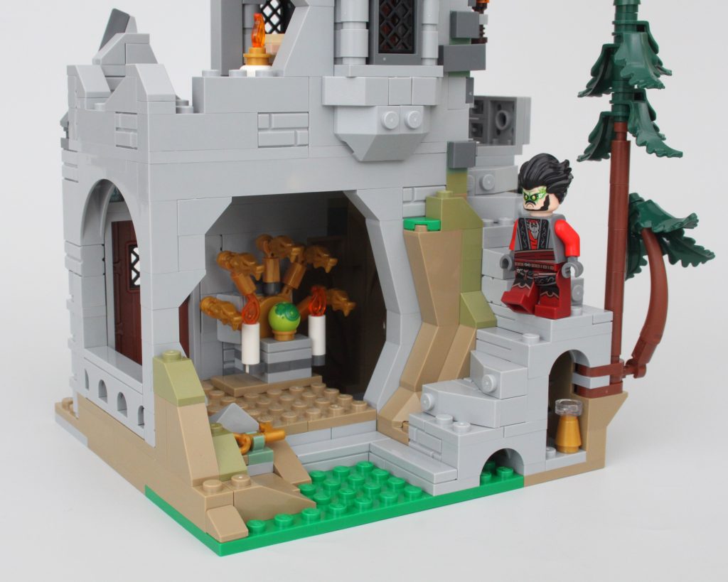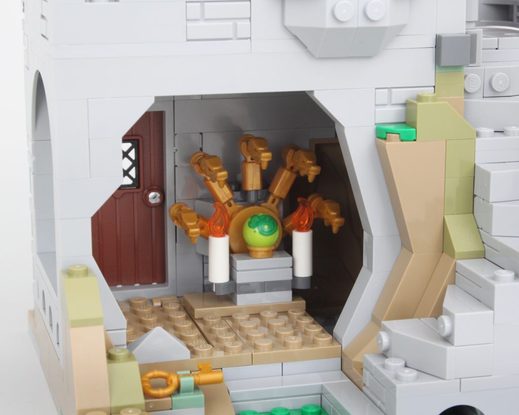 La alta torre sobre la caverna completa el modelo, llamando inmediatamente la atención y ofreciendo un lugar para que una minifigura misteriosa planee un plan mágico. El La oferta en la torre es magnífica y la integración de piezas transparentes para vidrieras con rejillas de metal en el frente es muy inteligente. El área de trabajo con pergaminos de hechizos y artefactos en exhibición también funciona bien y un círculo ritual se encuentra en el piso superior en lo que parece ser una novedad para el LEGO Group. También hay una trampilla que conduce a la caverna y una llave opera el mecanismo.