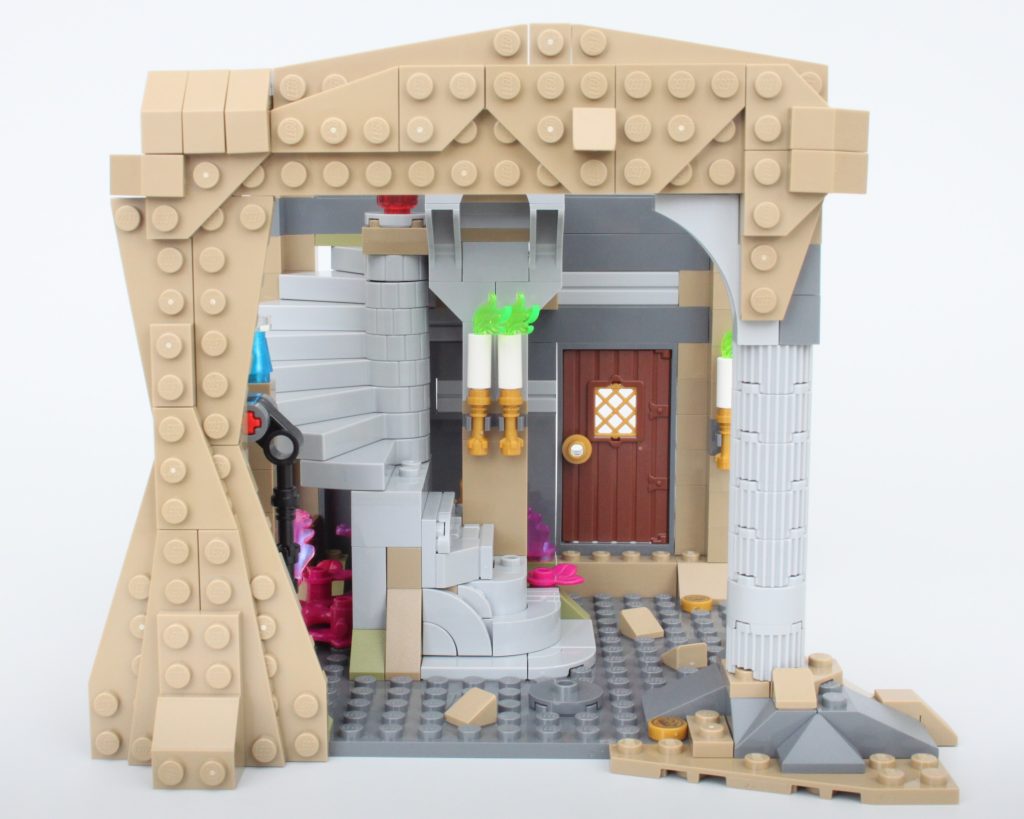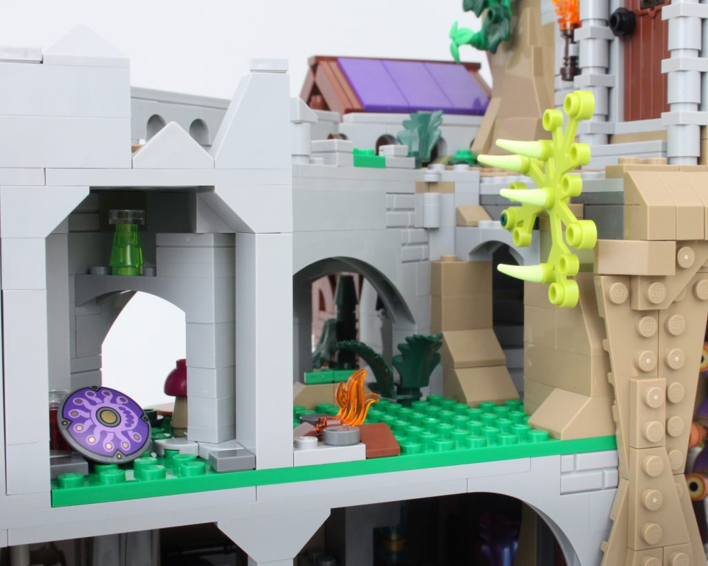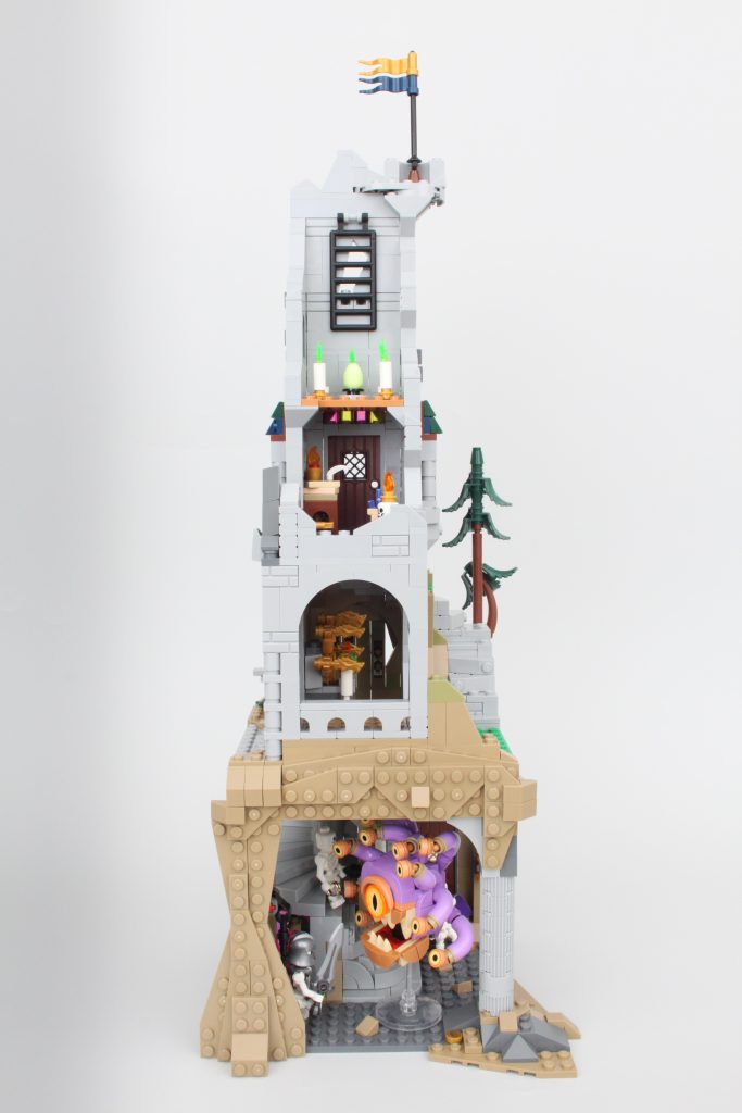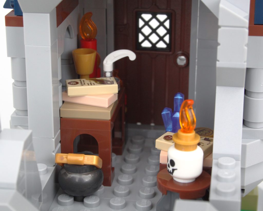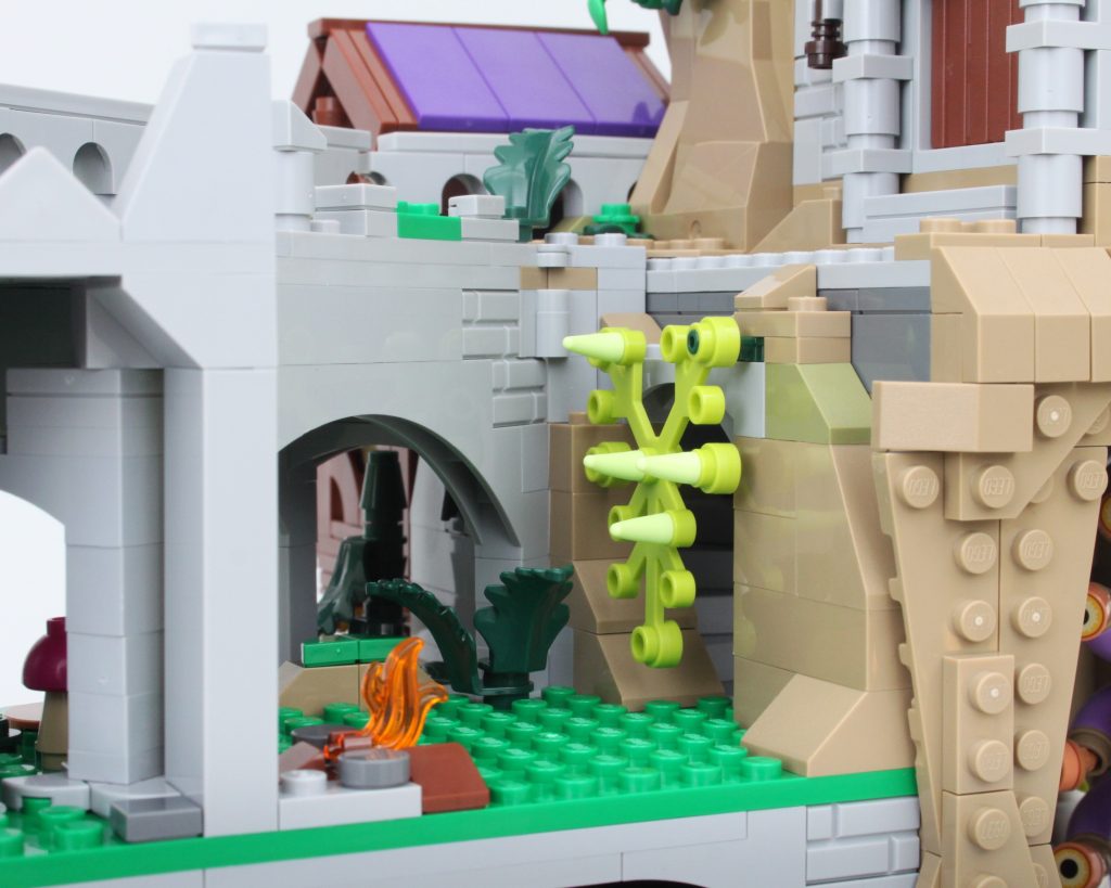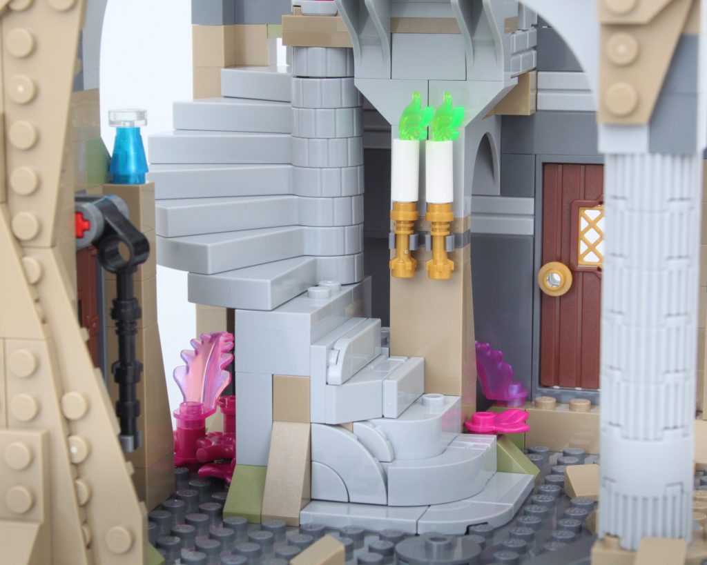 La alta torre sobre la caverna completa el modelo, llamando inmediatamente la atención y ofreciendo un lugar para que una minifigura misteriosa planee un plan mágico. El La oferta en la torre es magnífica y la integración de piezas transparentes para vidrieras con rejillas de metal en el frente es muy inteligente. El área de trabajo con pergaminos de hechizos y artefactos en exhibición también funciona bien y un círculo ritual se encuentra en el piso superior en lo que parece ser una novedad para el LEGO Group. También hay una trampilla que conduce a la caverna y una llave opera el mecanismo.