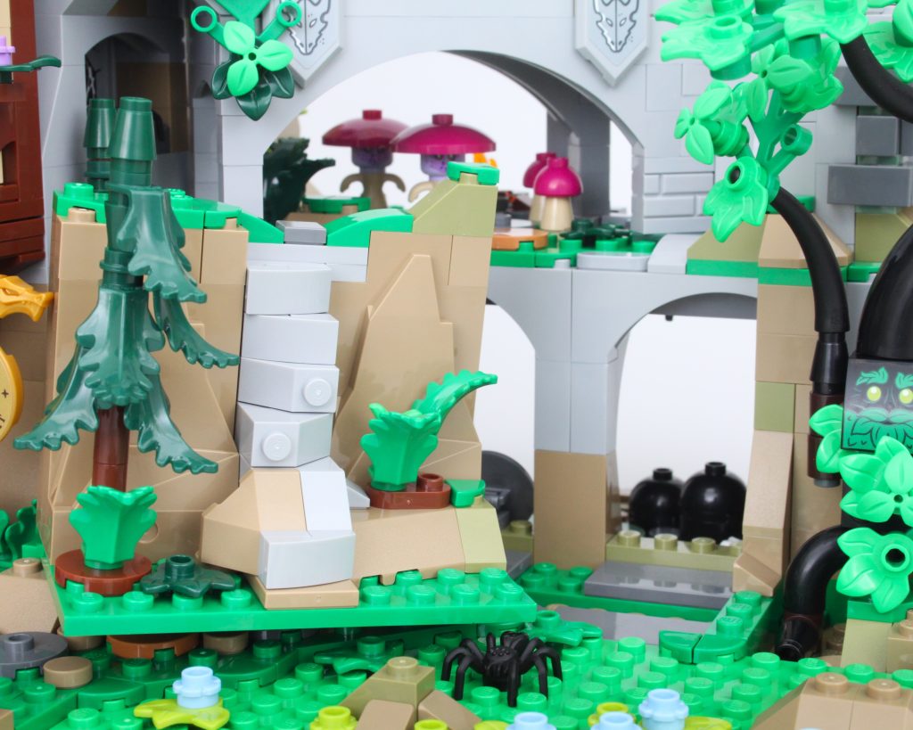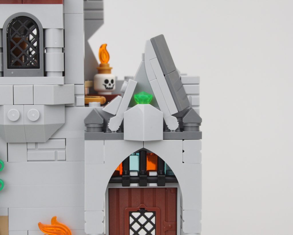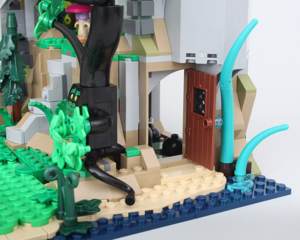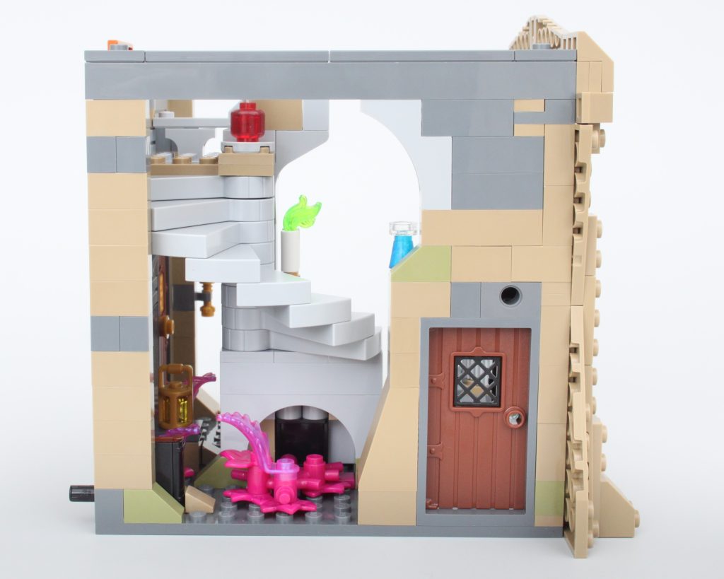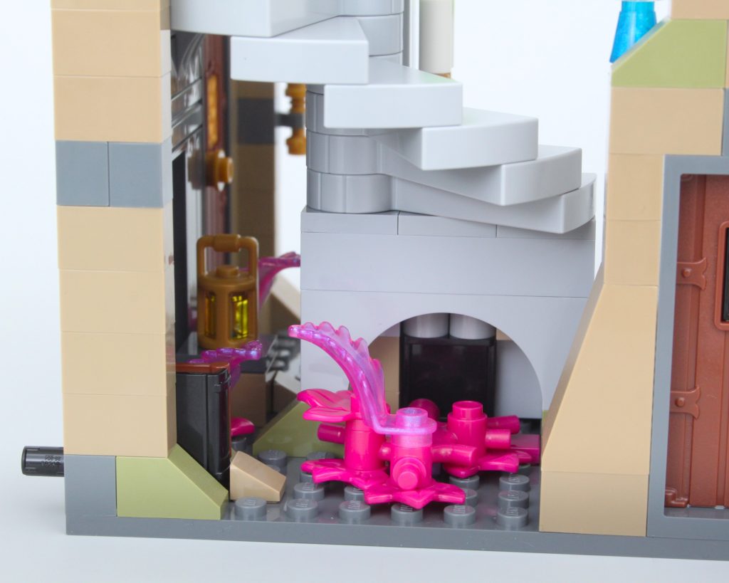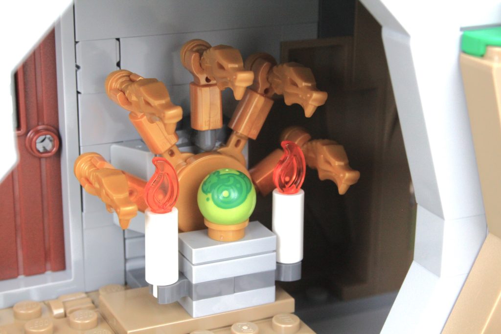 La alta torre sobre la caverna completa el modelo, llamando inmediatamente la atención y ofreciendo un lugar para que una minifigura misteriosa planee un plan mágico. El La oferta en la torre es magnífica y la integración de piezas transparentes para vidrieras con rejillas de metal en el frente es muy inteligente. El área de trabajo con pergaminos de hechizos y artefactos en exhibición también funciona bien y un círculo ritual se encuentra en el piso superior en lo que parece ser una novedad para el LEGO Group. También hay una trampilla que conduce a la caverna y una llave opera el mecanismo.