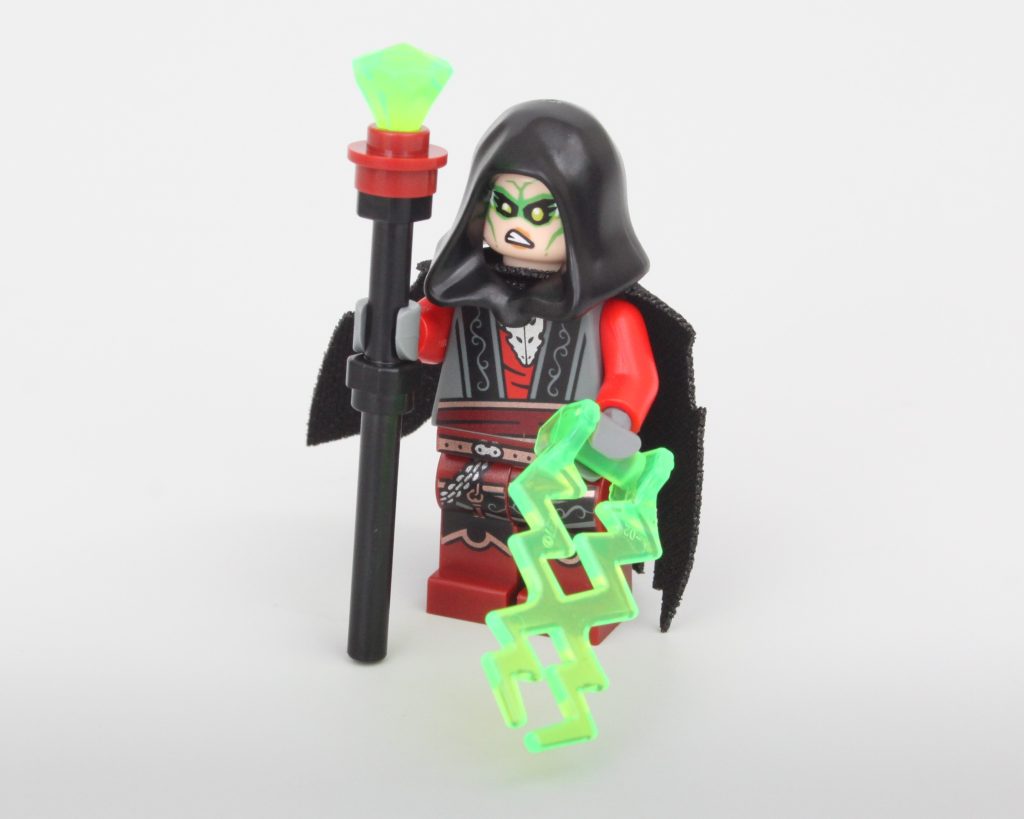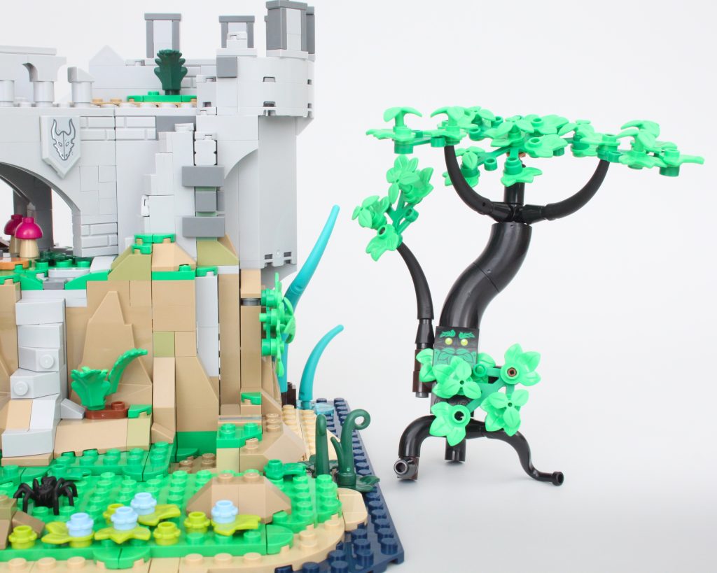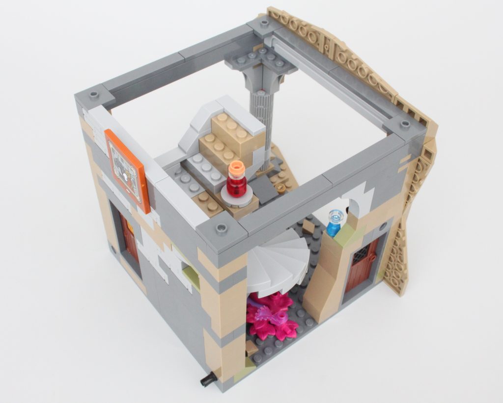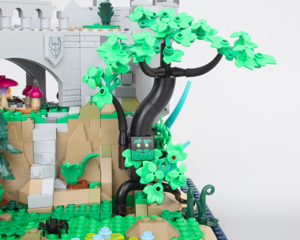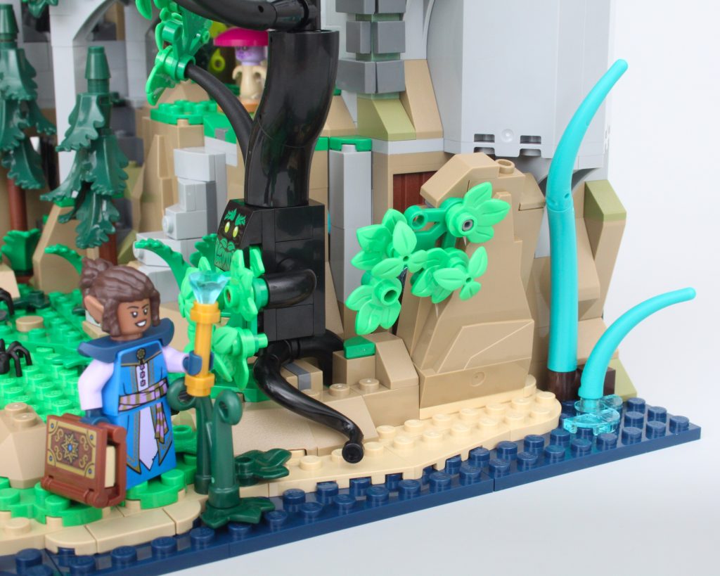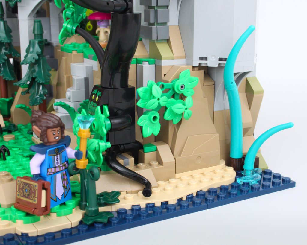 La alta torre sobre la caverna completa el modelo, llamando inmediatamente la atención y ofreciendo un lugar para que una minifigura misteriosa planee un plan mágico. El La oferta en la torre es magnífica y la integración de piezas transparentes para vidrieras con rejillas de metal en el frente es muy inteligente. El área de trabajo con pergaminos de hechizos y artefactos en exhibición también funciona bien y un círculo ritual se encuentra en el piso superior en lo que parece ser una novedad para el LEGO Group. También hay una trampilla que conduce a la caverna y una llave opera el mecanismo.