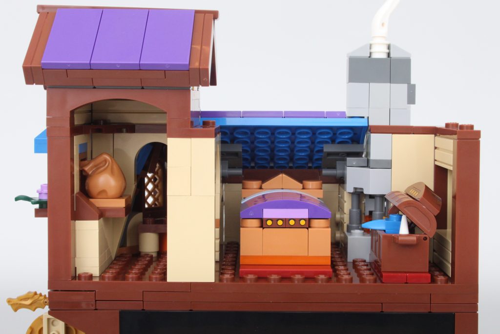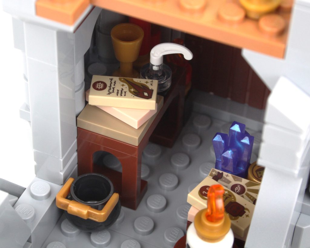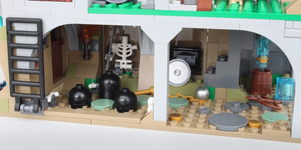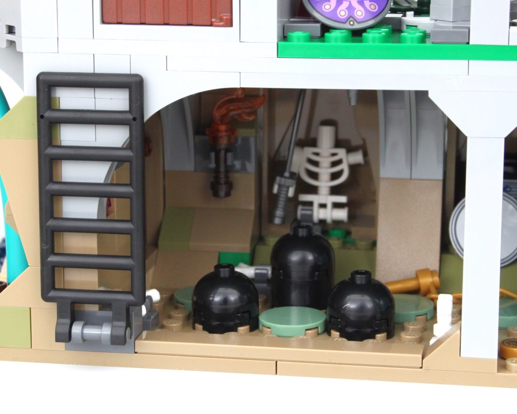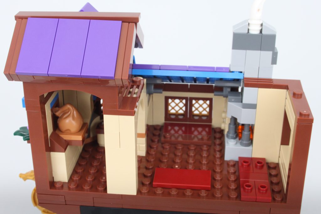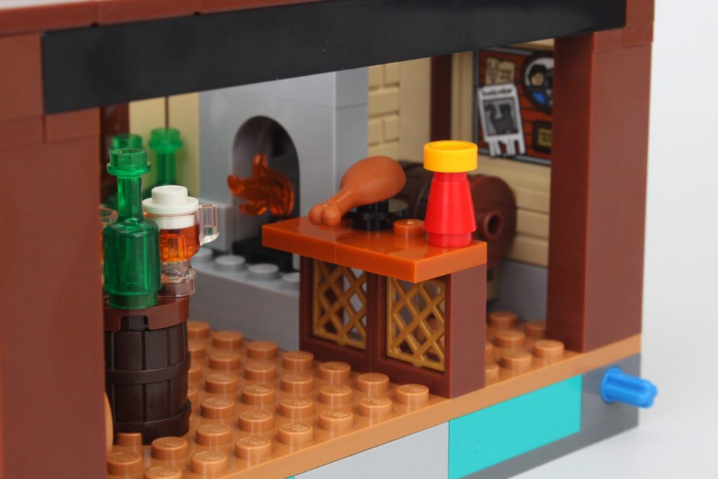 La taberna está dividida en dos pisos y es la mejor fuente de huevos de Pascua del conjunto. Desde el diseñador del ventilador como un caballero hasta la Columna Vertebral del Mundo y un símbolo de la organización Harpers, pasarás un tiempo reflexionando sobre lo que podría significar cada una de las pegatinas. Hay suficiente espacio para colocar algunas minifiguras en la planta baja, pero el piso de arriba está ocupado principalmente por algunos muebles agresivos.