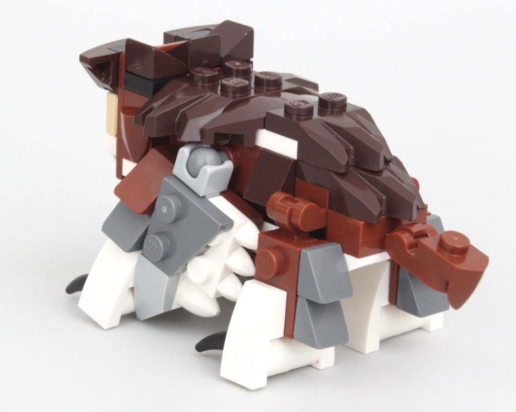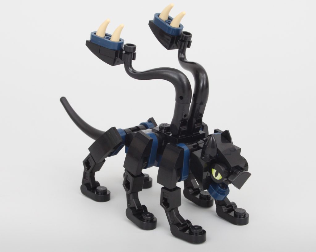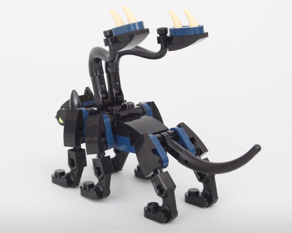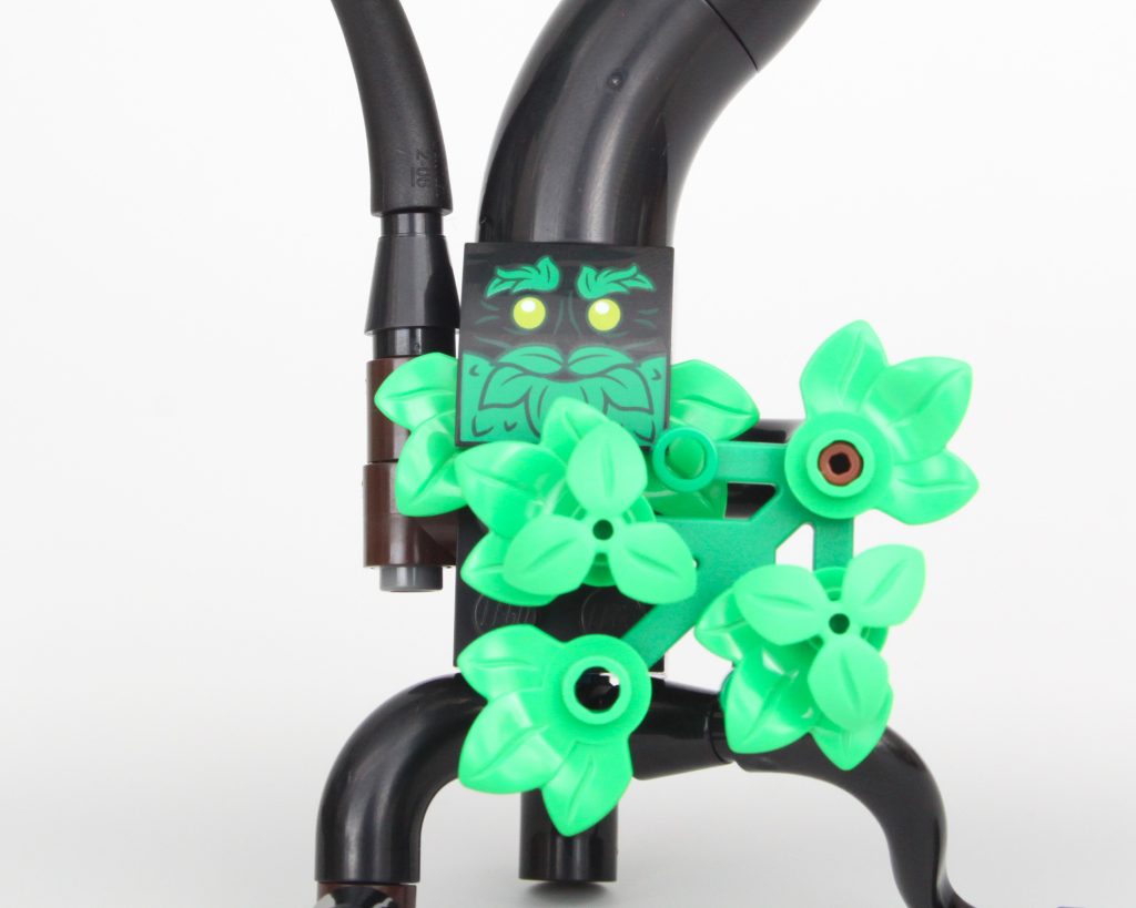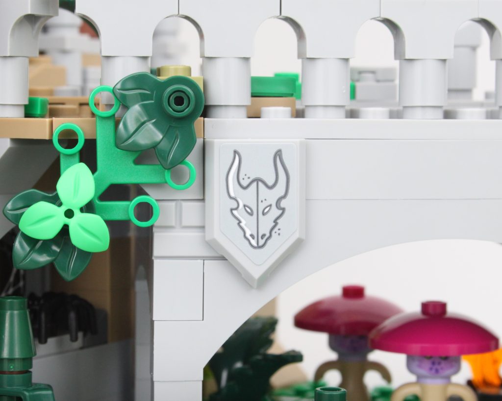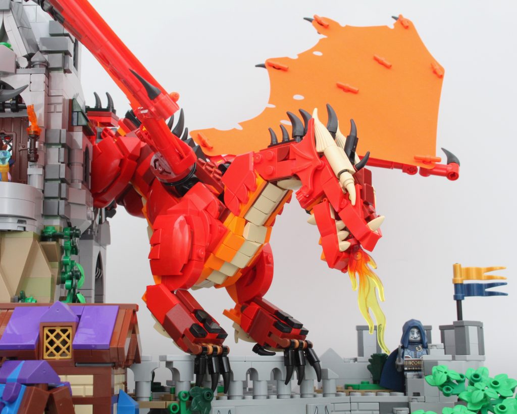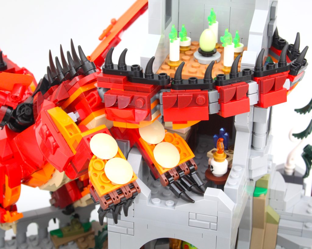 Los detalles de la carrocería son sublimes y la combinación de colores es impecable. Los cabezales de fregona en forma de cuernos son especialmente ingeniosos. Todo en este dragón funciona con todo lo que tiene al lado y todo se funde en un increíble dragón LEGO, pero tiene un defecto importante. Durante las primeras horas después de construir el dragón, la única rótula que une la cabeza al cuello se mantuvo fuerte. Después de moverlo unas cuantas veces para colocarlo en la torre, ha cedido y ya no es capaz de soportar el peso de la cabeza. Girarlo hacia un lado lo suficiente soluciona este problema, pero aún así es desafortunado que el dragón siempre esté mirando hacia abajo.