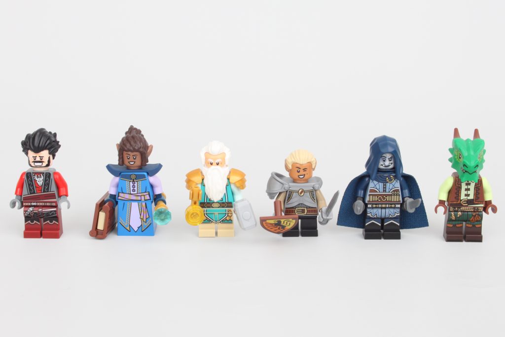 Las minifiguras del personaje principal del jugador son un clérigo enano con una brillante armadura dorada, un mago elfo que empuña un libro de hechizos, un luchador gnomo con un escudo resistente y un pícaro orco con capucha y capa. Las expresiones de las numerosas cabezas de minifiguras son excelentes y sorprendentemente expresivas. El ojo morado y el diente que le falta al clérigo son especialmente notables; después de todo, la clase puede ser bastante buena para recibir más golpes que la mayoría.
