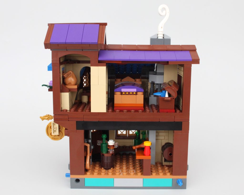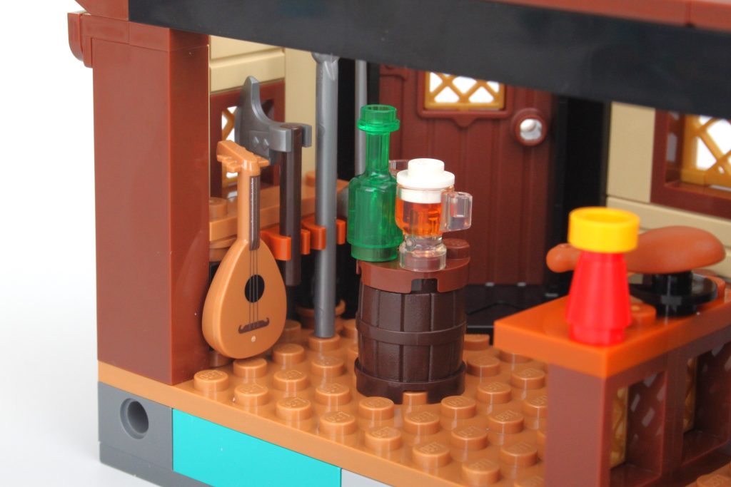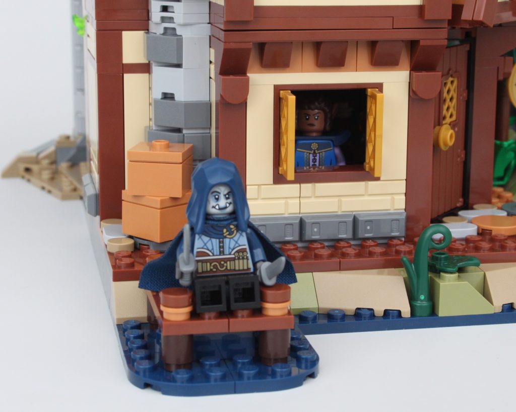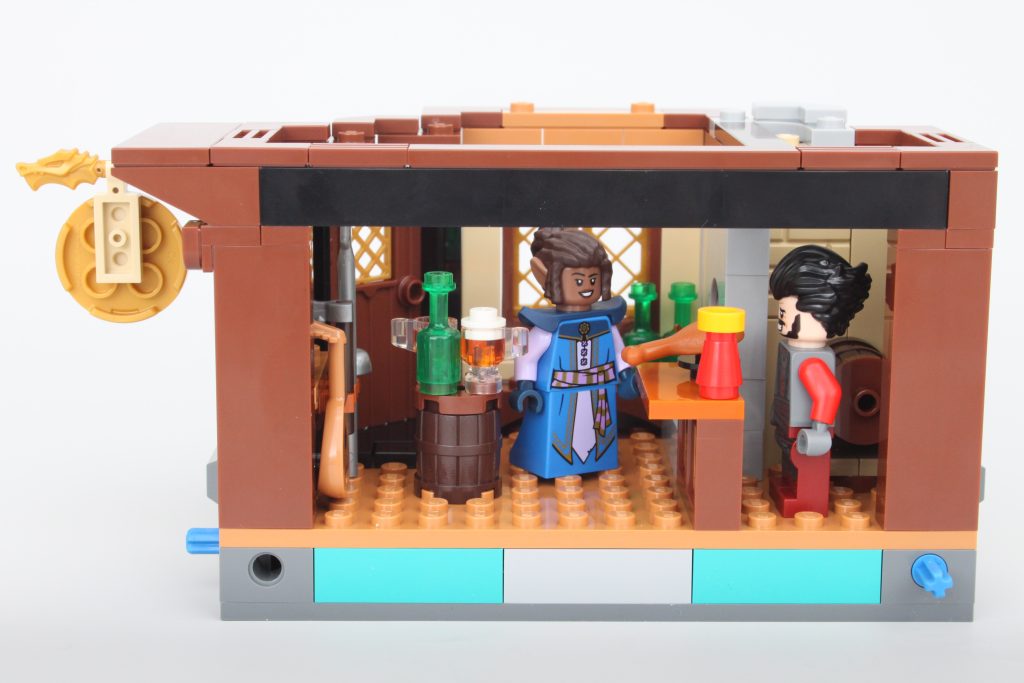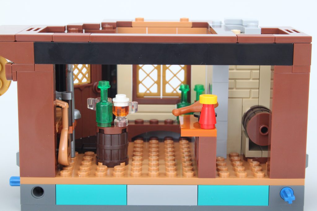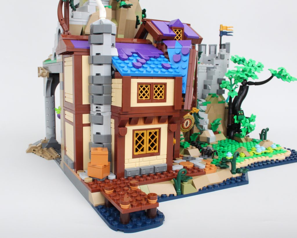 La taberna habría sido adecuada como conjunto independiente y este módulo viene completo con un pequeño muelle, mucha comida y bebida para las minifiguras y una cama completamente segura para dormir; no es necesario rodar para investigar. El exterior de la taberna está bellamente decorado para su tamaño, y la combinación de azul y morado para el techo es única pero adecuadamente caprichosa para un set de Dungeons & Dragons sin sentirse completamente fuera de lugar en una exhibición de LEGO Castle.