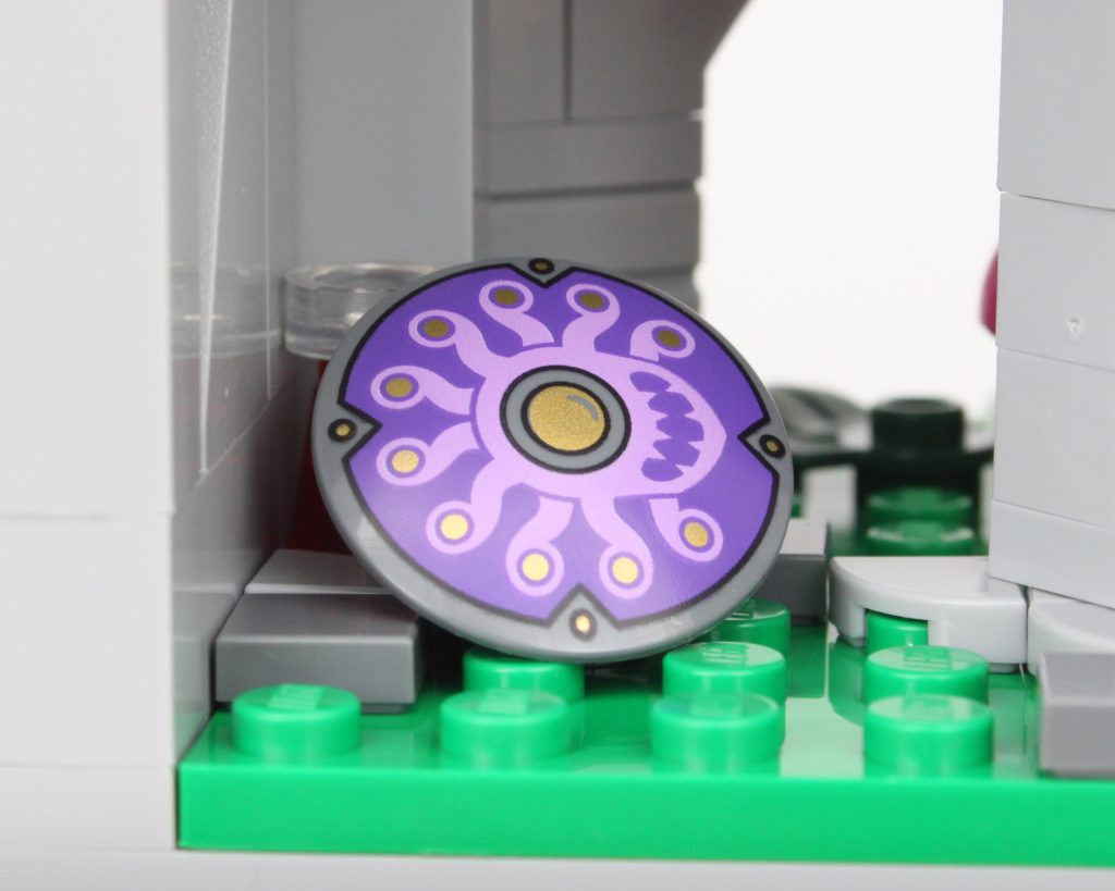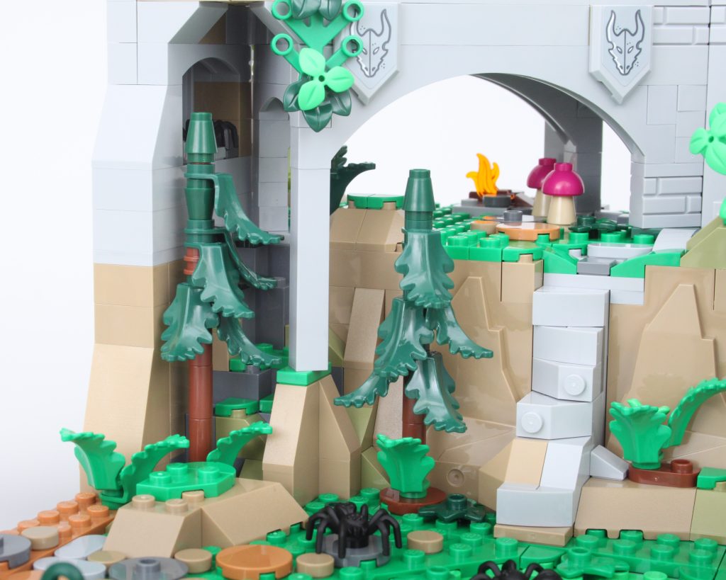 Sobre la pradera cargada de vegetación, un muro en ruinas proporciona refugio para una fogata, así como para una pequeña colonia de Myconid, y este espacio actúa como una introducción a una de las mejores características de LEGO. Ideas 21348 Dragones y Mazmorras: El cuento del dragón rojo: botín. Pociones, objetos, armas y armaduras se encuentran repartidos por todo el set para mejorar las minifiguras incluidas y esta área tiene el escudo impreso especialmente atractivo que representa un Escudo Centinela. El diseño Beholder en este escudo muestra un monstruo que aparecerá más adelante en el modelo y recuerda el esquema de color original del monstruo como se propuso en el proyecto Dragon's Keep diseñado por fanáticos.