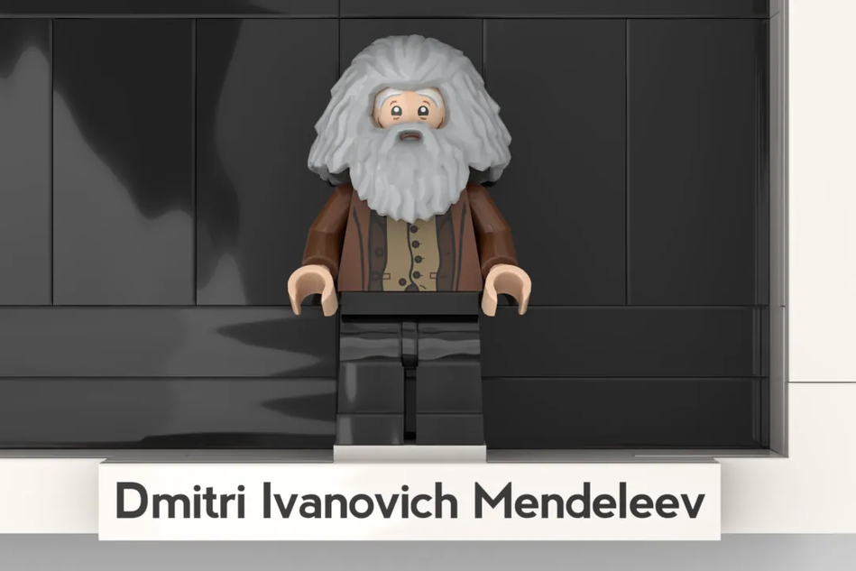 Para completar la tabla periódica de los elementos se incluye un mosaico impreso de 8 × 16 con el título de la construcción, además de una minifigura de Dmitri Ivanovich Mendeleev, el químico ruso que creó la primera versión de la tabla periódica en 1869.