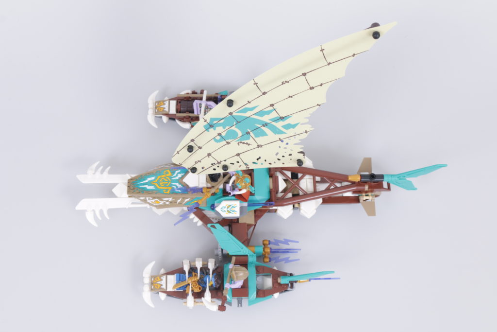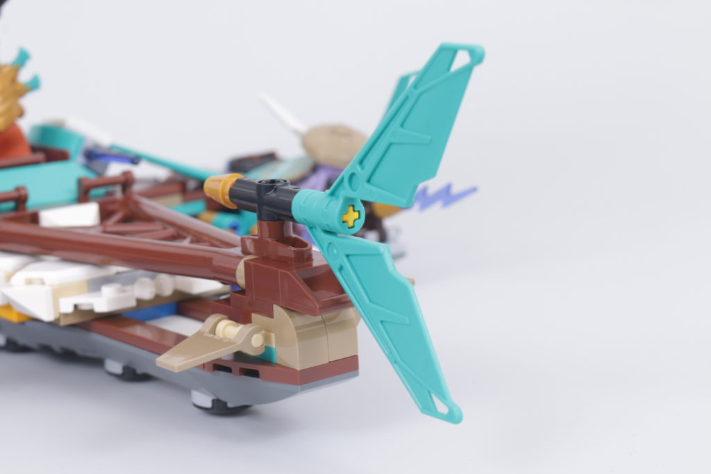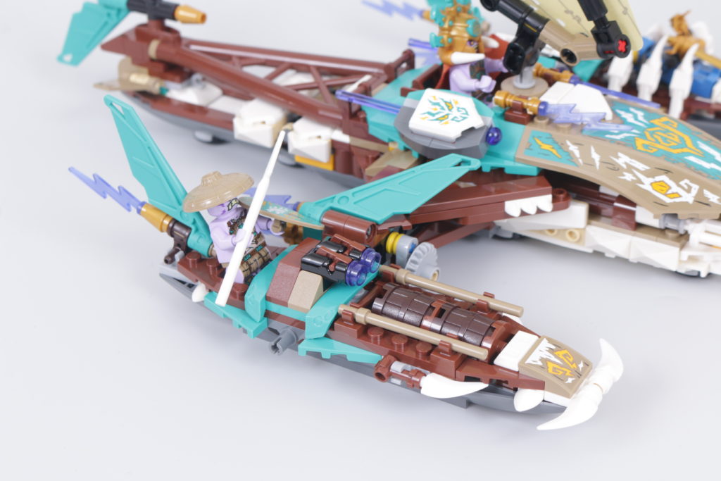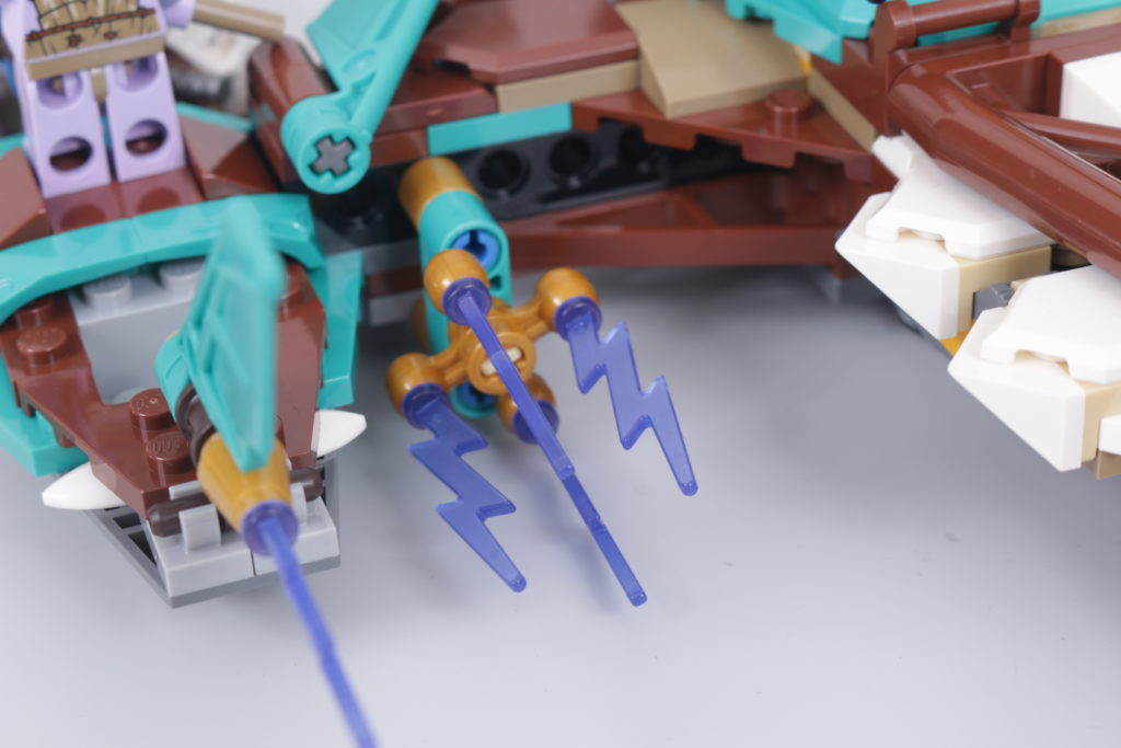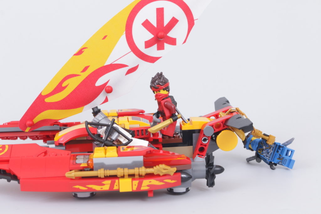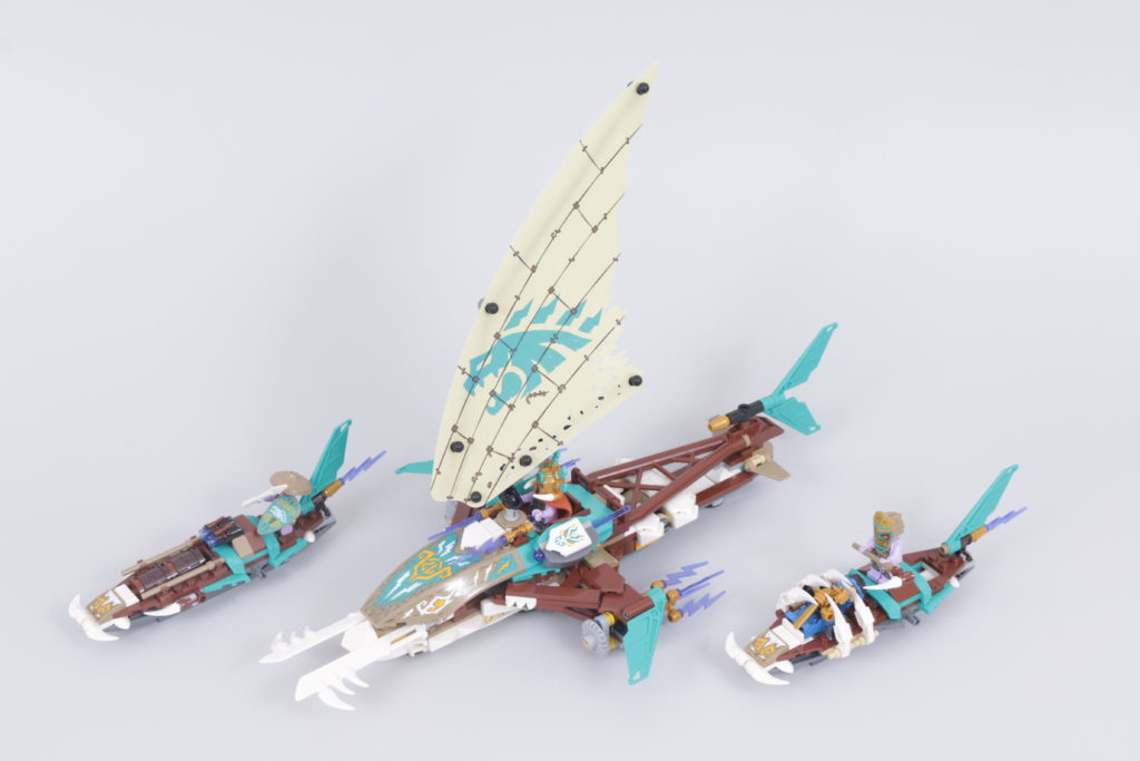 Entre ellos, sin embargo, hay un par de divertidos modelos LEGO que en creatividad y juego rebotan muy bien entre sí, a través de algunas características de juego simples y espacio puro de LEGO. Esas características de juego incluyen tiradores automáticos (por supuesto) y efectos transformadores para ambos catamaranes: Kai se pliega en lo que el LEGO Group llama 'modo de velocidad', mientras que el de los Guardianes puede retraer algunas lanzas del casco central y dividirse en tres barcos separados.