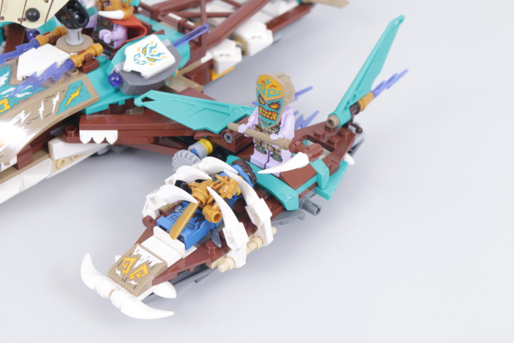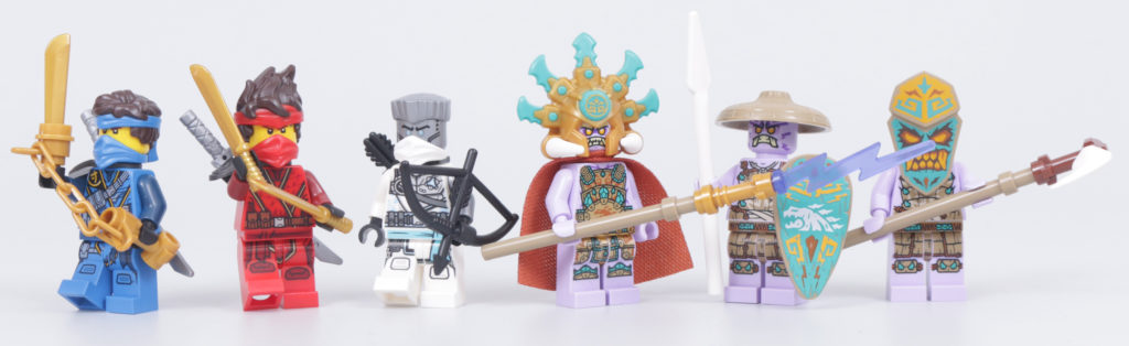 Sin embargo, por el tamaño de ese catamarán más grande, cambiar uno de los tres ninjas por un cuarto guardián no habría sido la peor decisión, en particular por el diseño interesante y la selección de accesorios que cada uno de ellos tiene en este set (de nuevo, ninguno es exclusivo aquí). Su diseño es donde mejor se puede sentir la inspiración de los isleños y los aventureros, desde el escudo y la máscara hasta el tocado del jefe Mammatus que es que recuerda a la del rey Achu, de más de 20 años antes.