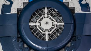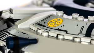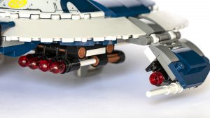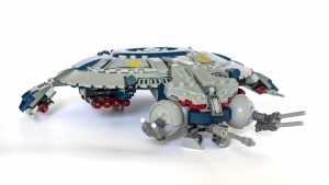 La cubierta frontal, la zona de la cabina y las torretas de los cañones también están muy bien diseñadas, destacando especialmente los respiraderos del núcleo del reactor de la cañonera en el medio del fuselaje. Un uso inteligente de un anillo parabólico junto con algunos clips se encuentra en la parte superior de la nave, lo que agrega un gran detalle y un acabado maravilloso al modelo.