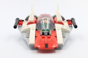 Sobre esta base se han colocado principalmente pendientes curvas para conseguir la elegancia necesaria, y todas las piezas detalladas están impresas en lugar de utilizar pegatinas. Se trata de una elección de diseño que gustará tanto a adultos como a niños. Incluso esta versión en miniatura del A-wing toma prestadas piezas de sus homólogos a escala real, como los álabes estabilizadores y la cubierta de la cabina. Estas piezas parecen un poco exageradas en este pequeño modelo y la nave entera podría haber sido un poco más larga para aliviar el problema de la escala.