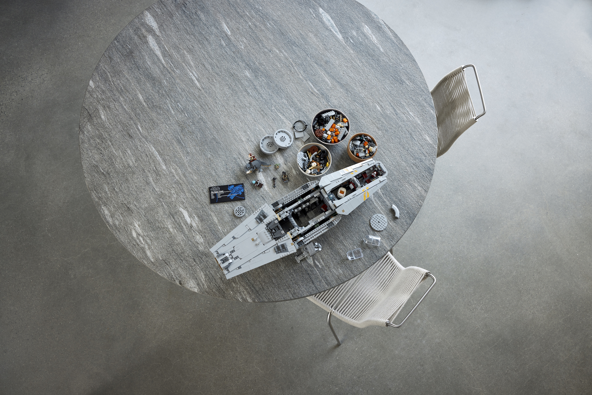 Con 6,187 piezas, el modelo final mide la asombrosa cifra de 72 cm de largo, casi el doble que el modelo 75292 de The Razor Crest. Este tamaño adicional ha permitido que el UCS Razor Crest incorpore motores desmontables para construir con ladrillos, una cápsula de escape e incluso una cámara de congelación de carbono a escala de minifigura, superando con creces a su modelo contemporáneo, mucho más pequeño (y mucho más económico).