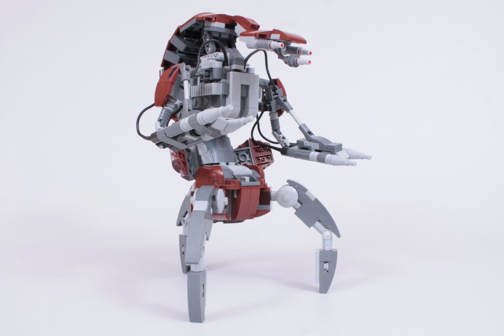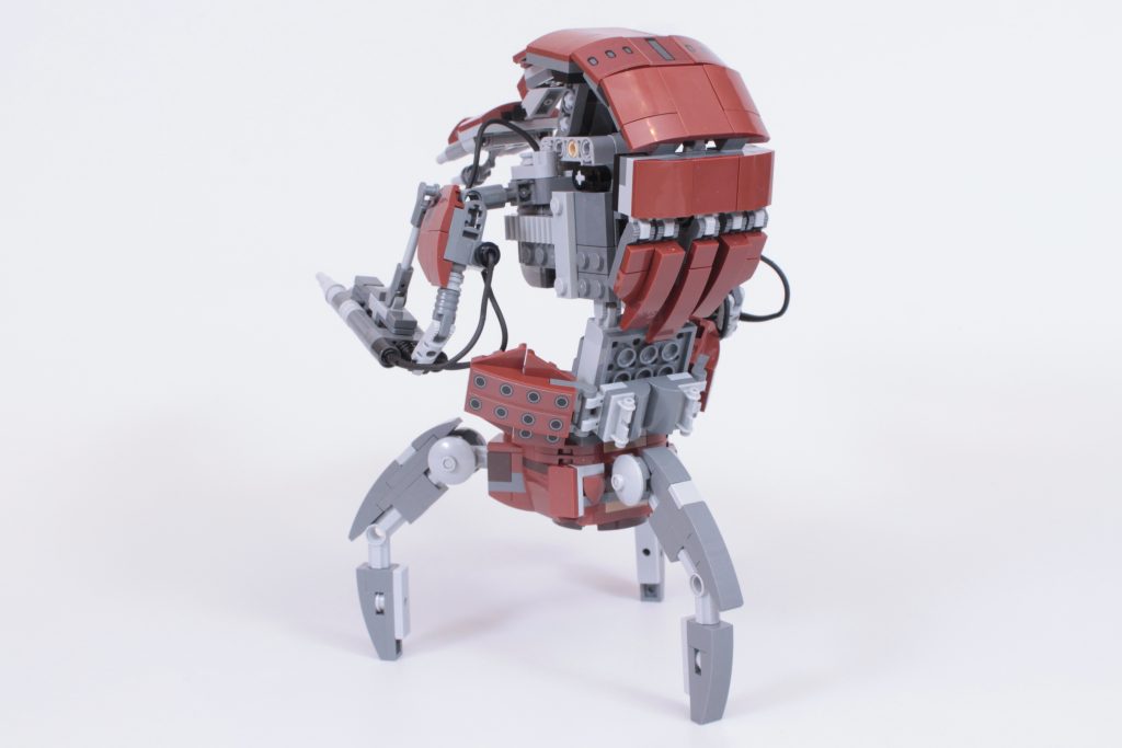 Las proporciones del modelo terminado son prácticamente perfectas, con quizás el único punto débil siendo el volumen de la sección media. Pero no lo notarías sin colocar la versión LEGO junto a la que se ve en pantalla, y eso demuestra lo bien que la construcción general transmite la impresión de un Droideka: te convence al instante de una manera que no se puede decir de personajes como 75255 Yoda o 75371 Chewbaca.