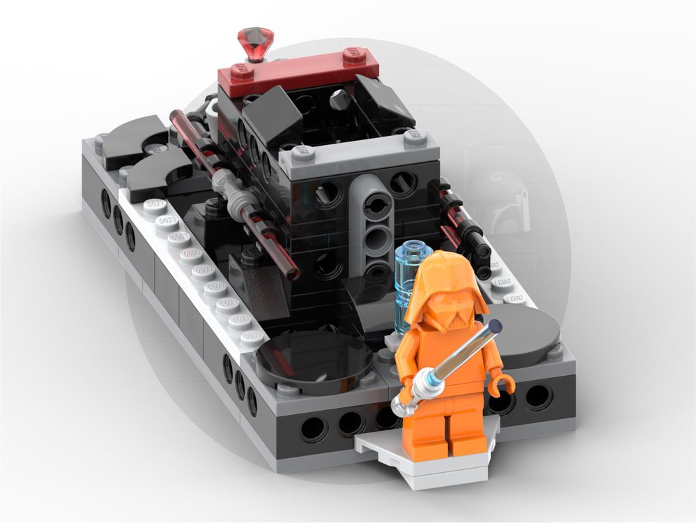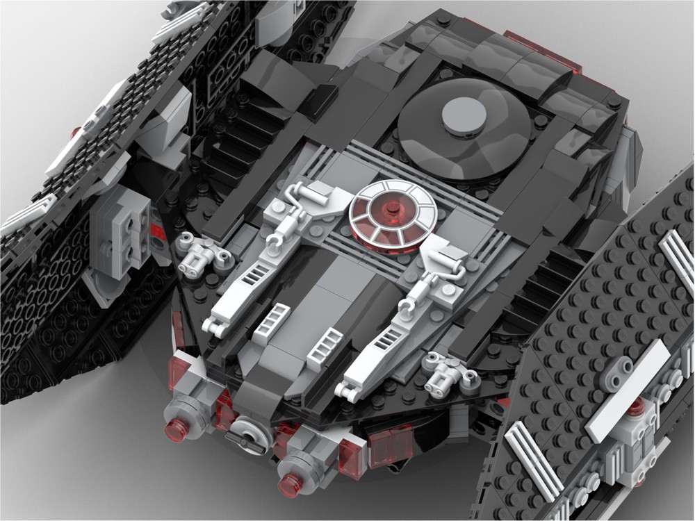 Esta creación personalizada reutiliza las piezas del Halcón Oscuro (75389) para crear una enorme representación del Silenciador TIE, con peana y cuatro asientos en su interior. Ninguna de las minifiguras se ve afectada por esta configuración, lo que significa que puedes guardar a Darth Jar Jar a un lado de forma segura.